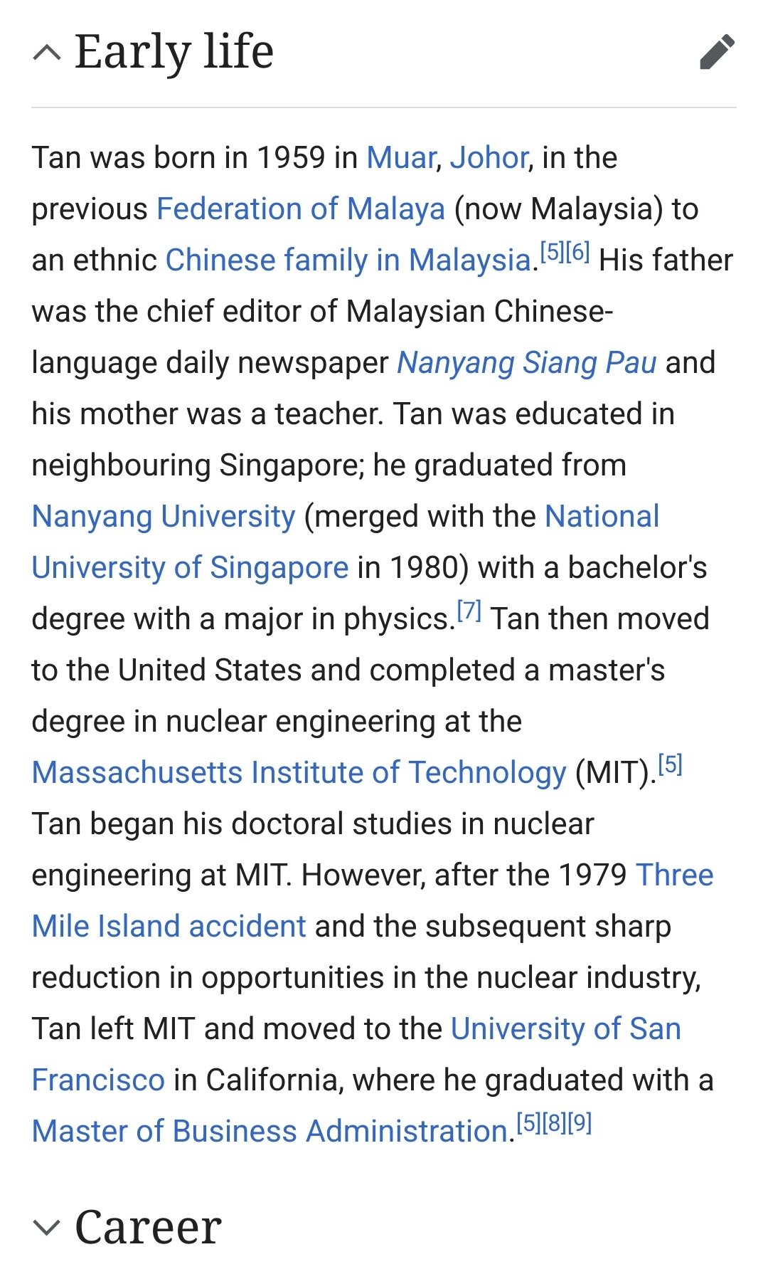 Tan was born in 1959 in Muar, Johor, in the previous Federation of Malaya (now Malaysia) to an ethnic Chinese family in Malaysia.[5][6] His father was the chief editor of Malaysian Chinese-language daily newspaper Nanyang Siang Pau and his mother was a teacher. Tan was educated in neighbouring Singapore; he graduated from Nanyang University (merged with the National University of Singapore in 1980) with a bachelor's degree with a major in physics.[7] Tan then moved to the United States and completed a master's degree in nuclear engineering