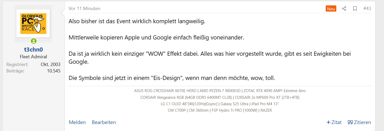 bin sehr auf die umsetzung gespannt ... im september wird auch wieder mal ein neues iphone pro fällig (bin noch auf dem 15er pro unterwegs). bin sehr gespannt wie sie die designsprache in die hardware umsetzen wollen, was ja ebenfalls geplant ist.