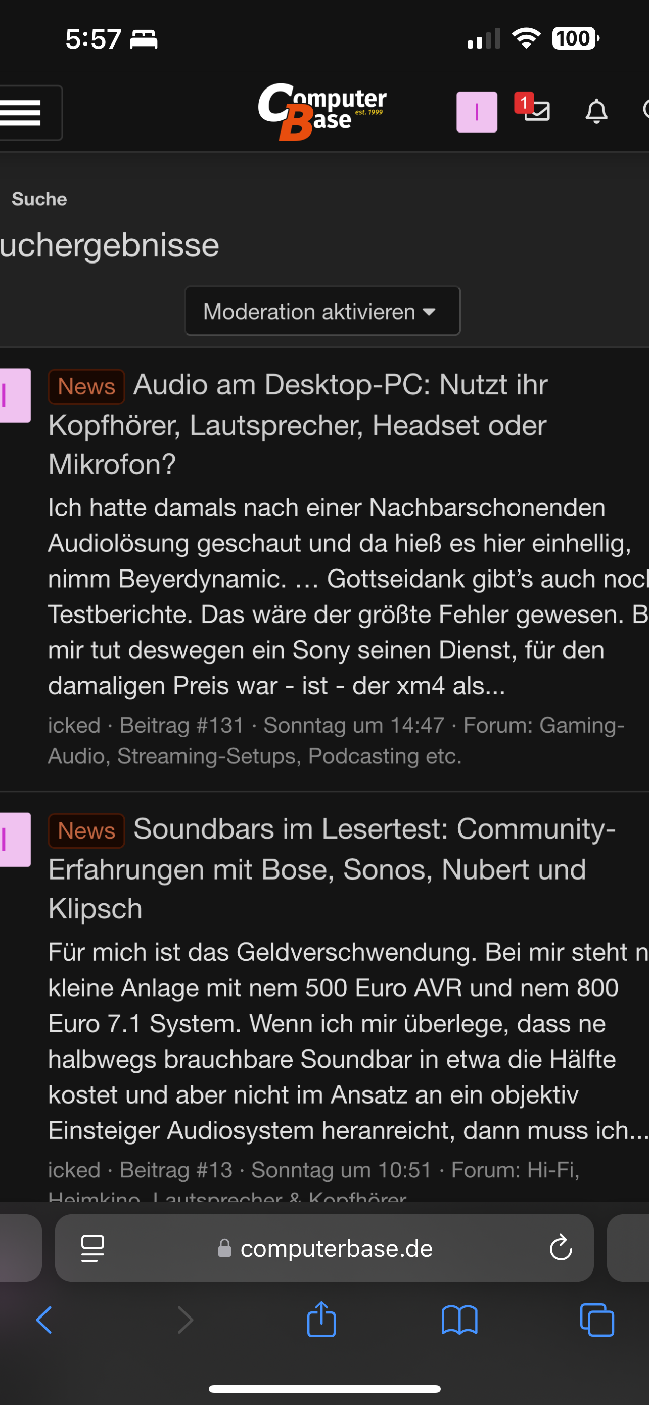 Wenn ich ganz oben auf mein Profil klicke, dort auf die Zahl rechts von „Beiträge“ erhalte ich ein Suchergebniss mit all meinen Beiträgen. Oben rechts ist dann die Taste „Moderation aktivieren“. Ich traue mich nicht, drauf zu klicken. In XenForo wird das diskutiert … aber auf den Style geschoben bzw. der Thread ist sechs Jahre alt.