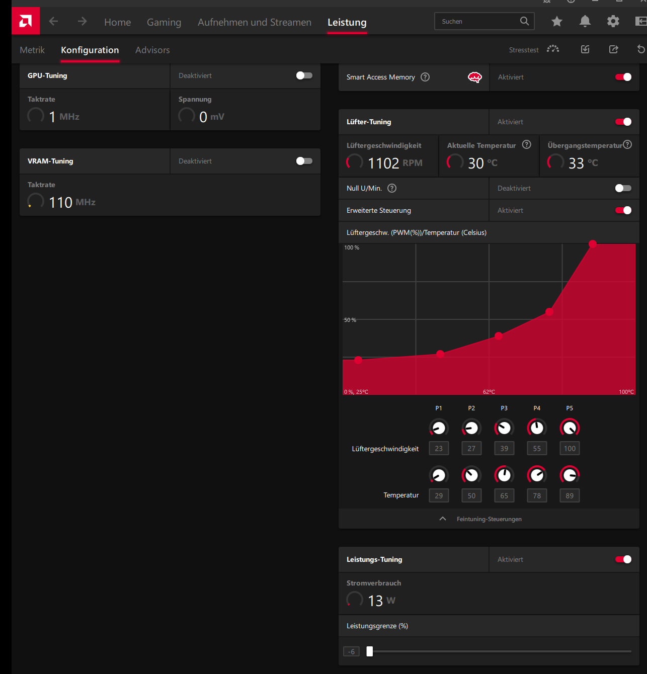 Um die minimal einstellbare Lüfterdrehzahl zu ermitteln müsst Ihr in aller Regel mit Support Tools wie MSI Afterburner oder bei AMD Wattmann eine manuelle Lüfterkurve erstellen. Ich warne hier ausdrücklich davor dass das Erstellen einer manuellen Lüfterkurve Risiken wie Überhitzung bis hin zum Garantie Verlust mit sich bringen kann. Für eventuelle Beschädigung einer Grafikkarte beim ermitteln der minimal möglichen Drehzahl übernehme ich keine Haftung oder Verantwortung.