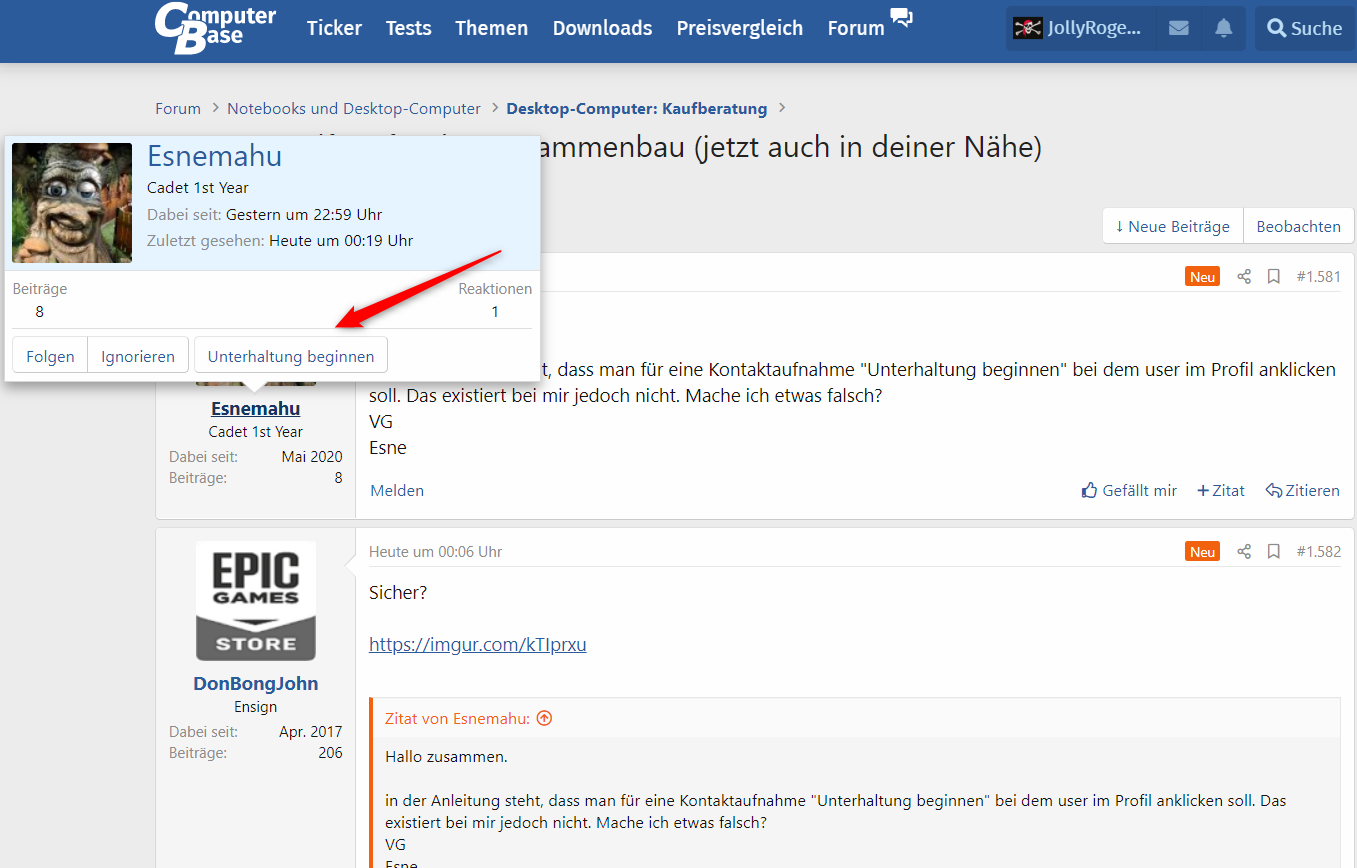 in der Anleitung steht, dass man für eine Kontaktaufnahme "Unterhaltung beginnen" bei dem user im Profil anklicken soll. Das existiert bei mir jedoch nicht. Mache ich etwas falsch?