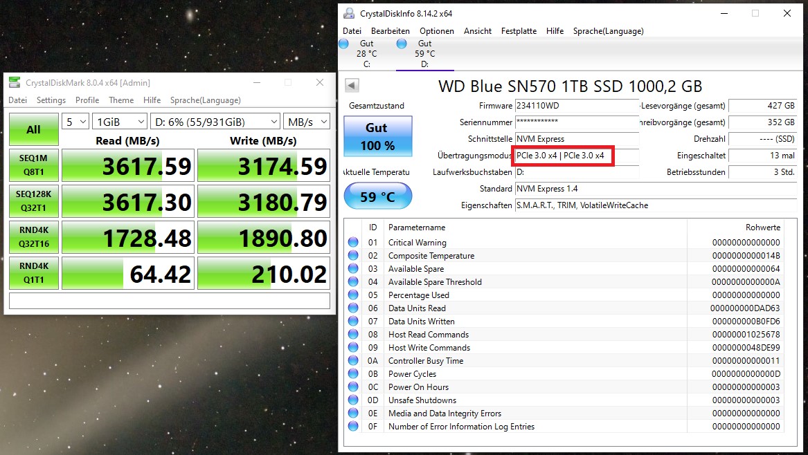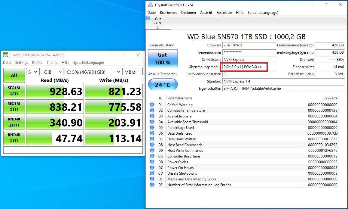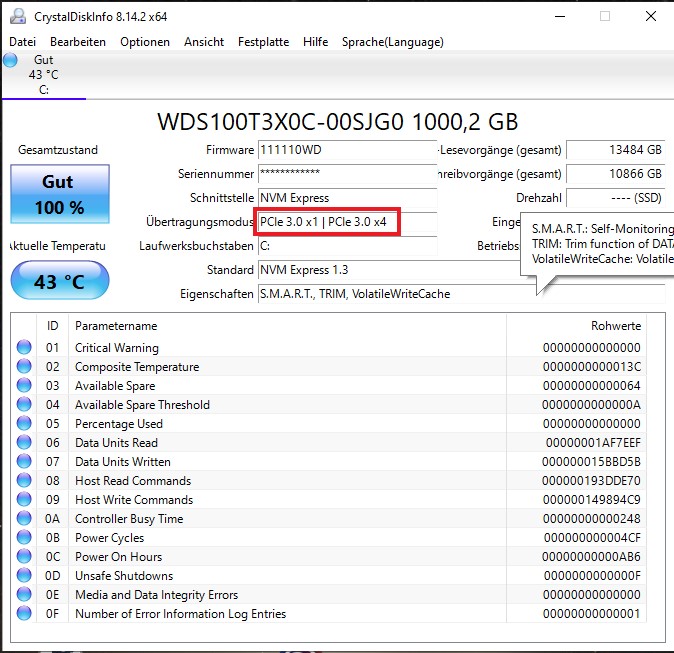 In meinem Haupt-PC (B450-Mainboard mit Ryzen 5700X) wird sie korrekt erkannt und liefert auch die richtigen Übertragungsraten. Wenn ich die SN750 aus meinem Haupt-PC ins LIVA einbaue, wird auch diese nur mit x1 statt x4 erkannt. Dazu siehe Screenshots.
