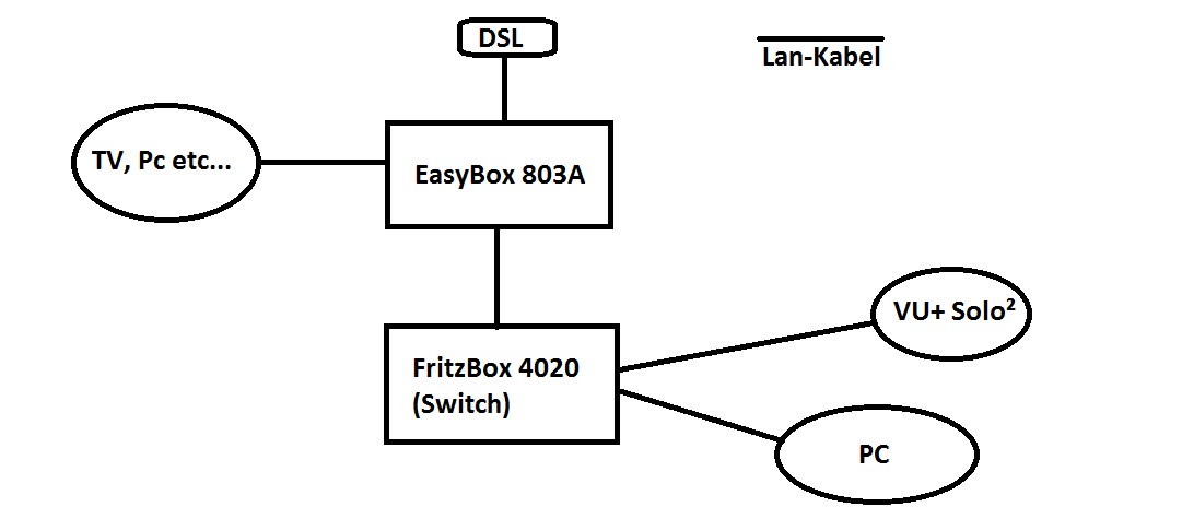 Ich habe das Lan Kabel von der EasyBox and der FritzBox am Lan-Port stecken, sowie auch den PC und die VU+ Solo².