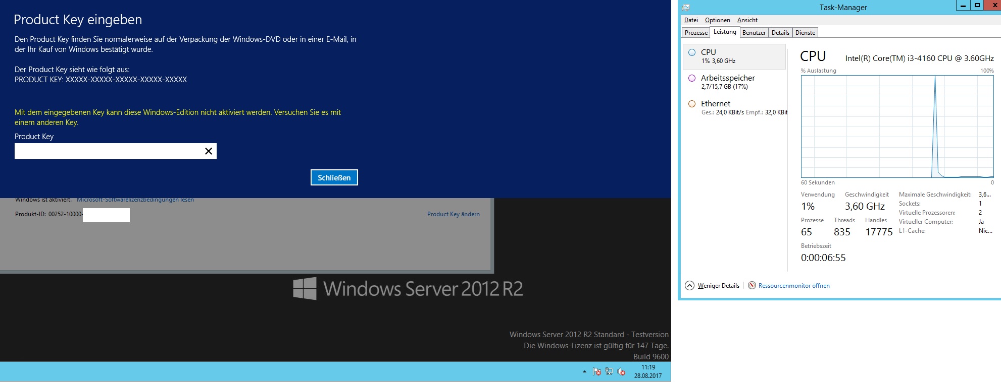 Beim Aufsetzen waren noch 4 virtuelle CPU'S bei HyperV definiert, nun habe ich den Server heruntergefahren und auf 2 virtuelle CPU's umgestellt und nochmals versucht den Key einzugeben, erfolglos.