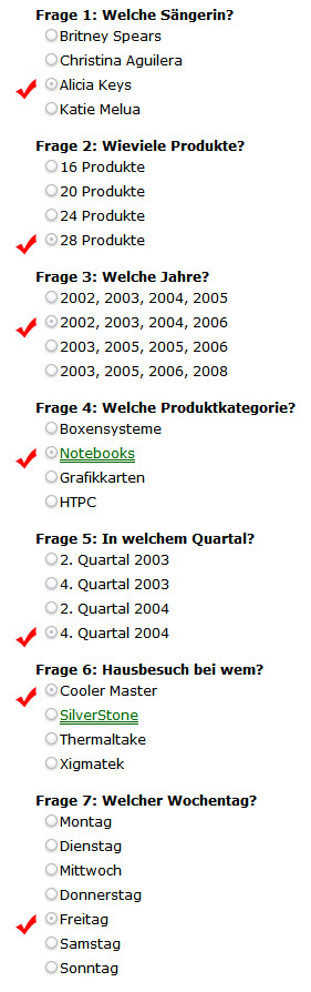 Ein paar Lösungen könnte ich richtig haben, aber zum Schluß hab ich dann einfach was angeklickt - rein aus Zeitmangel, habe mein Teilnahmeformular gestern (letzter Tag) um 23:58 Uhr abgesendet.