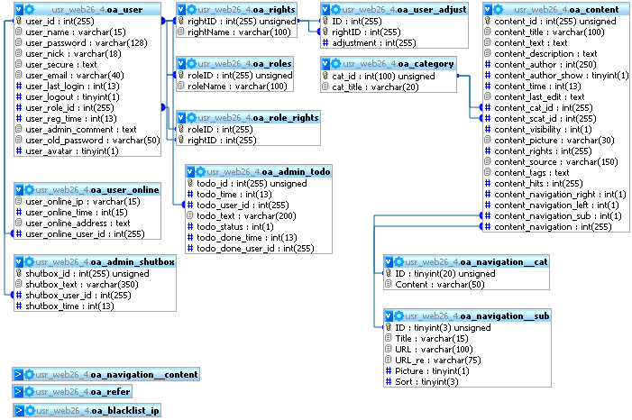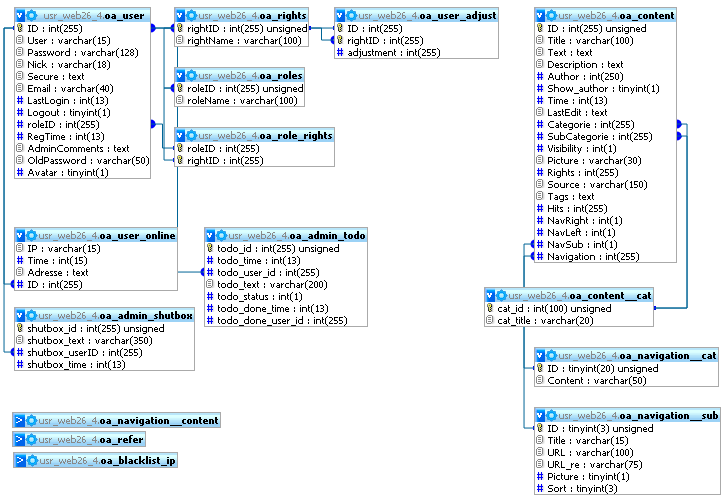 Du hast übrigens eine schreckliche Namensgebung. Bei Content heißt der Primärschlüssel "ID" und bei Categorie plötzlich "cat_id"??? Außerdem komische Groß-Kleinschreibung und andere komische Sachen. Du solltest dir schon überlegen, ob du die Attribute (Spalten) nun groß oder klein schreiben willst, oder mit Unterstrich oder zusammen. Bei der Tabelle "oa_user" lautet der Primärschlüssel anscheinend "ID", bei "oa_content__cat" dann aber wie gesagt anscheinend "cat_id". Doch wieso heißt dann die Spalte "SubCategorie" in "oa_content" nicht logischerweise "sub_category"? Solche Inkonsistenzen machen das ganze extrem schwer zu durchschauen.