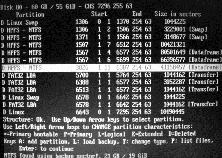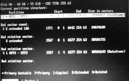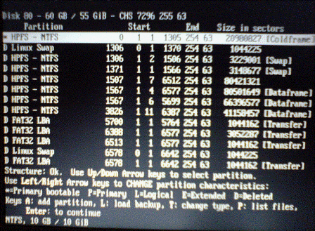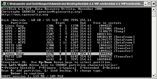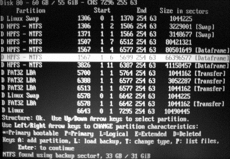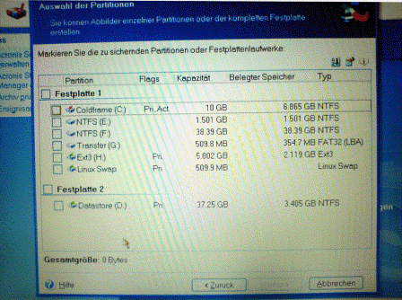 Dann verschob ich noch die LinuxSwap-Partition hinter die Windows-Bootpartition und damit habe ich wohl meine Erweiterte zerlegt. Kein wirkliches Backup (wie könnte es auch sonst sein? *brech*) und das Dataframe ist für mich in keinster Weise mehr zugänglich (RAW?). Aber, wie sollte es auch anders sein, liegen leider dort genau die benötigten Daten für mein Studium. Von allen anderen Partitionen habe ich im Nachhinein noch eine verwertbare atensicherung ziehen können. Vom wichtigen Dataframe nur ein "Raw-Backup".