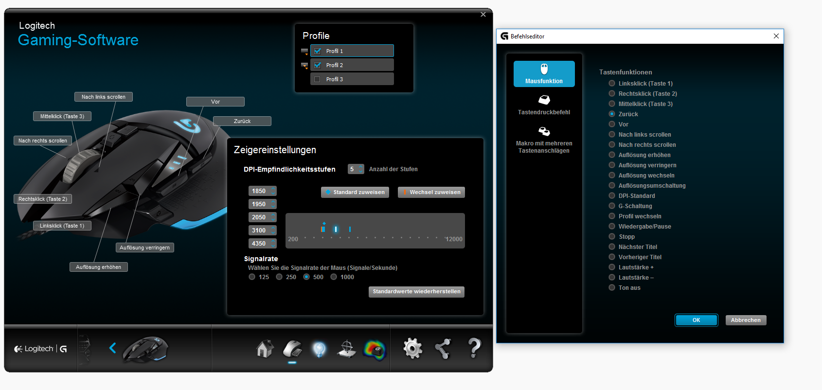 irgendwie komme ich mit der neuen Gaming Software von Logitech nicht zurecht und kann mir damit nicht ein Spielprofil erstellen, wie ich es gerne hätte. Ich habe Jahrelang die G500 benützt und mache das auch noch, da mir das Handling der Maus so gut zusagt, habe ich den Baugleichen Nachfolger, die G500s schon vor einiger Zeit gekauft, damit nach einen Ausfall der G500 quasi die gleiche Maus zur Verfügung ist. Allerdings braucht die G500s schon die Gaming Software von Logitech, die G500 läuft noch mit der SetPoint Software.