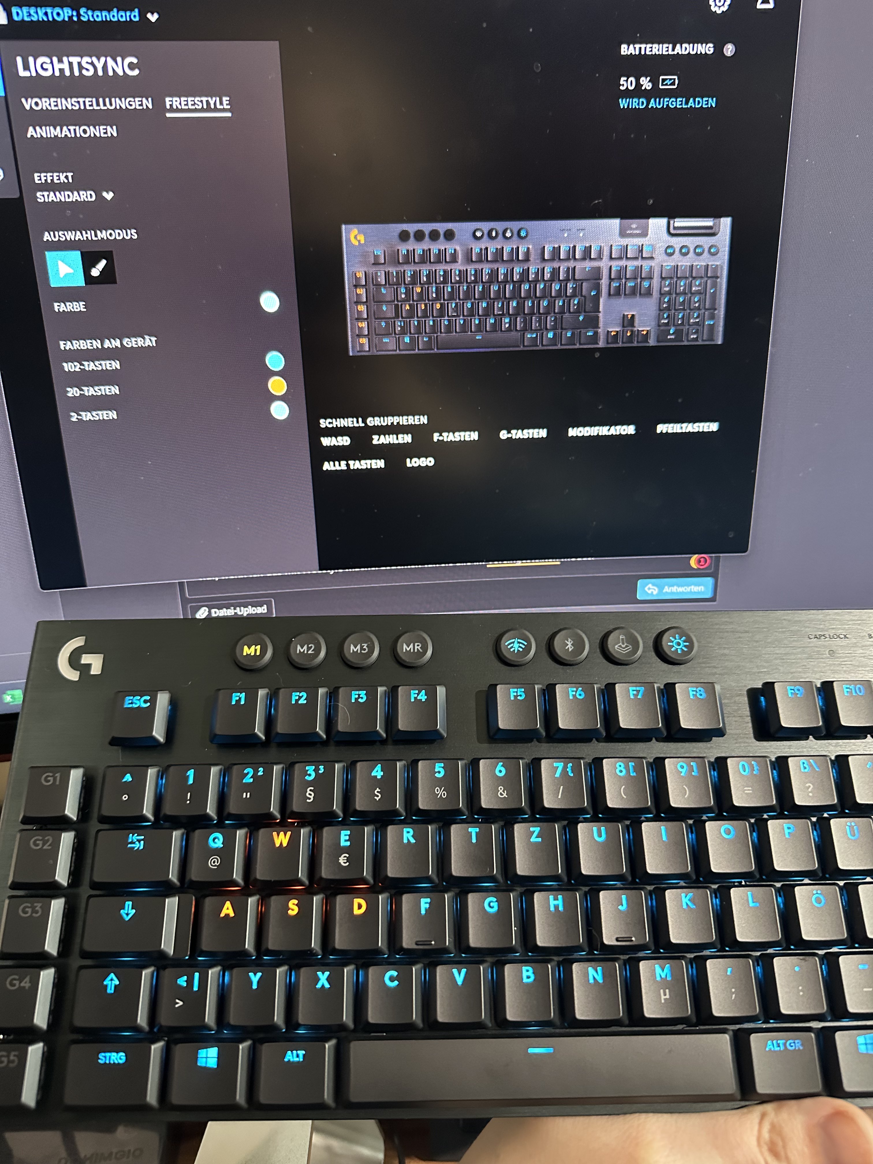 Von daher leuchtet bei mir auf der neuen Tastatur das Logo, die G-Tasten und die Mediatasten nicht. Und das nur, wenn ich das mit Freestyle mache. Leuchten tun sie alle im voreingestellten Modus.