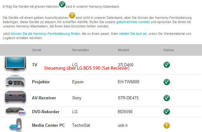 soweit ich bisher rausgebkommen habe ist sowohl mein Fernseher, Reciever, Verstärker und Beamer über eine Logitch Harmony Fernbedienung ansteuerbar.