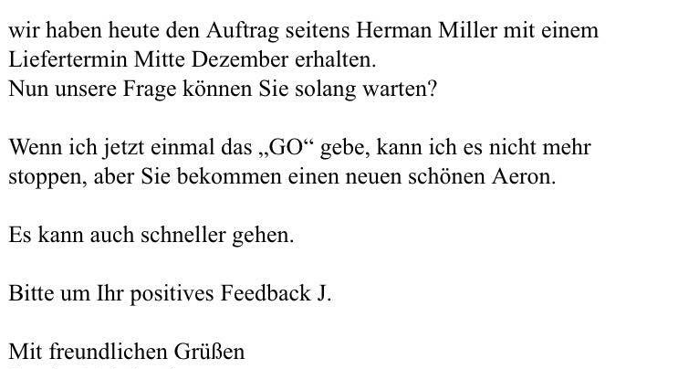 Mein Vater hat einen für die Arbeit benötigt und ist dann zu dem Laden gefahren, die uns sowieso mit den Bürosachen und auch Kopierern ausrüsten und dort probegesessen.