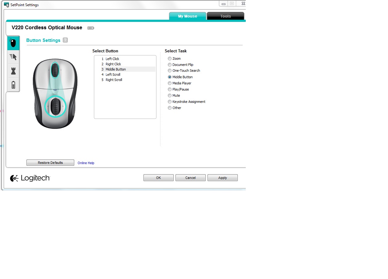 Ja, ich hab auch keine Tastenbelegung in Setpoint. Die Mausrad-Scrollfunktion scheint von Logitech fix vorgegeben zu sein. Wenn das Scrollen gar nicht funktioniert könnte vielleicht der Scrollsensor kaputt sein (zum Testen müsstest das Gerät mal an einem anderen Computer anstecken).