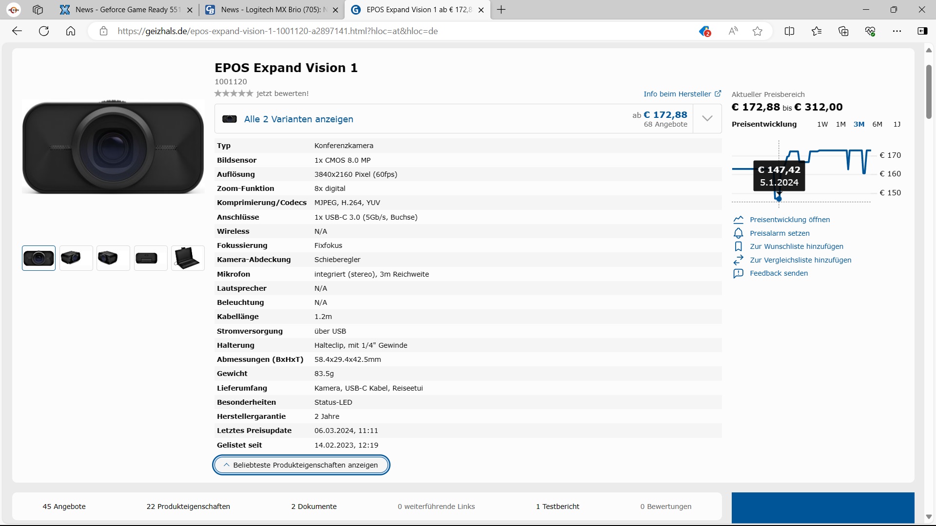 Bei Webcams fühlte ich mich schon immer ein bisschen über den Tisch gezogen, was den Preis in Relation zum Gebotenen betrifft. Aber hier wird man weit über den Tisch an die Wand geschleudert. 229€....Wenn ich mich bei den IP Cams umschaue, kriegt man für das Geld zwei bis drei die weit mehr können