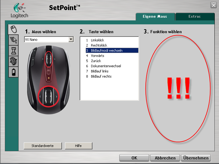 Kann man der VX Nano irgendwie beibringen, dass der Klick auf Scrollrad als mittlere Maustaste funktionieren soll? In der SetPoint-Software an sich geht es leider nicht.