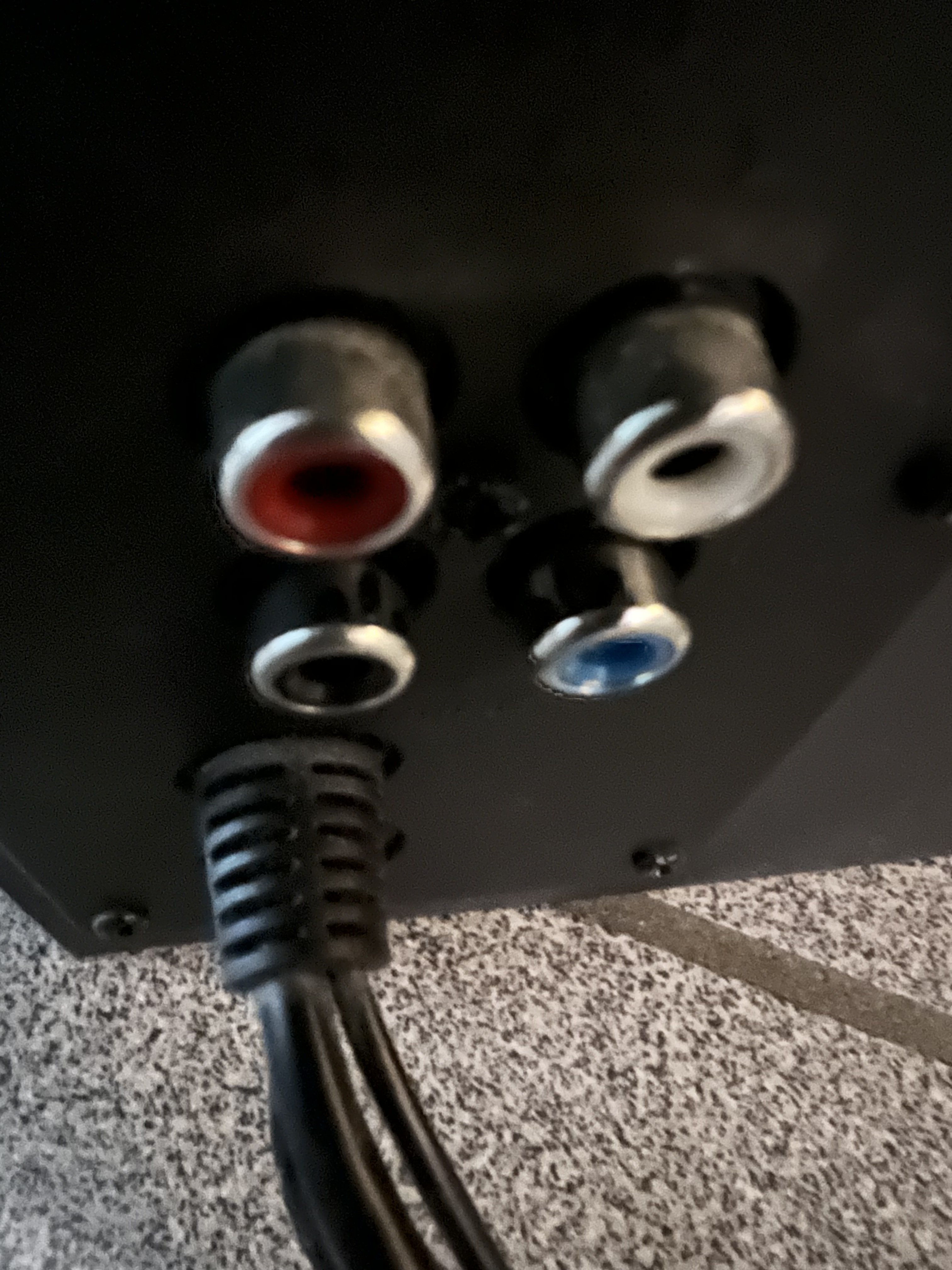 Vom Subwoofer aus geht ein Stromkabel zur Mehrfachsteckdose, ein Kabel zum PC für den Sound und ein Kabel zum Steuergerät. Die Boxen sind jeweils mit einem Kabel an den Line-Out Ausgängen des Subwoofer angeschlossen. Die linke Box blau, die rechte Box schwarz. Das benutzte ich so wie gesagt schon einige Jahre. Die linke Box brummt sofort, wenn ich das System einschalte.