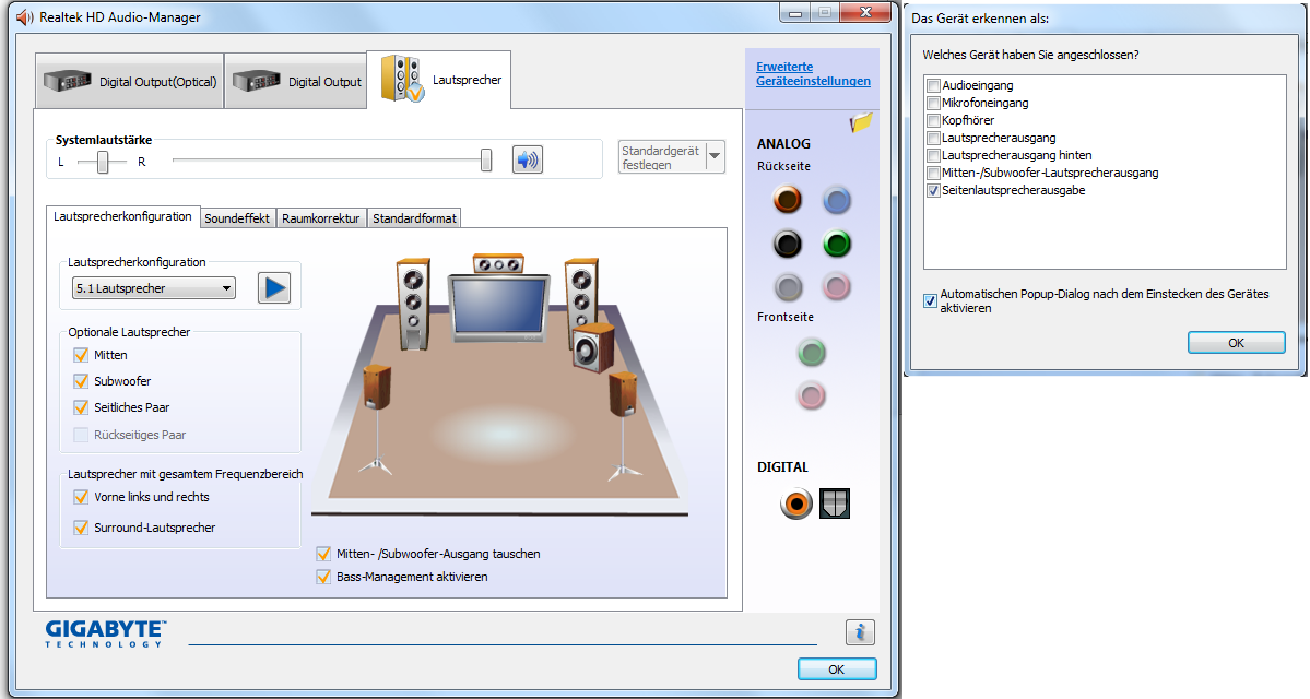 beim Realtek Audio Manager hab ich die Buchsen zugewiesen. Orange = Center und Subwoofer, Schwarz = Lautsprecherausgang hinten (rear l/r) und Grün = Seitenlautsprecherausgabe (front l/r)
