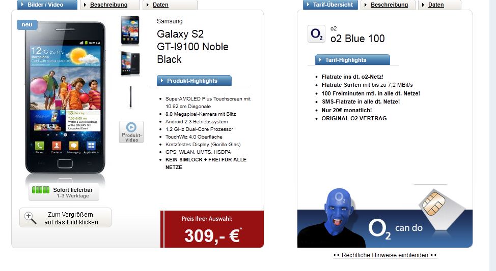 Samsung Galaxy S2 GT-I9100 + O2 Blue 100 für 309 Anzahlung +20 Euro monatlich