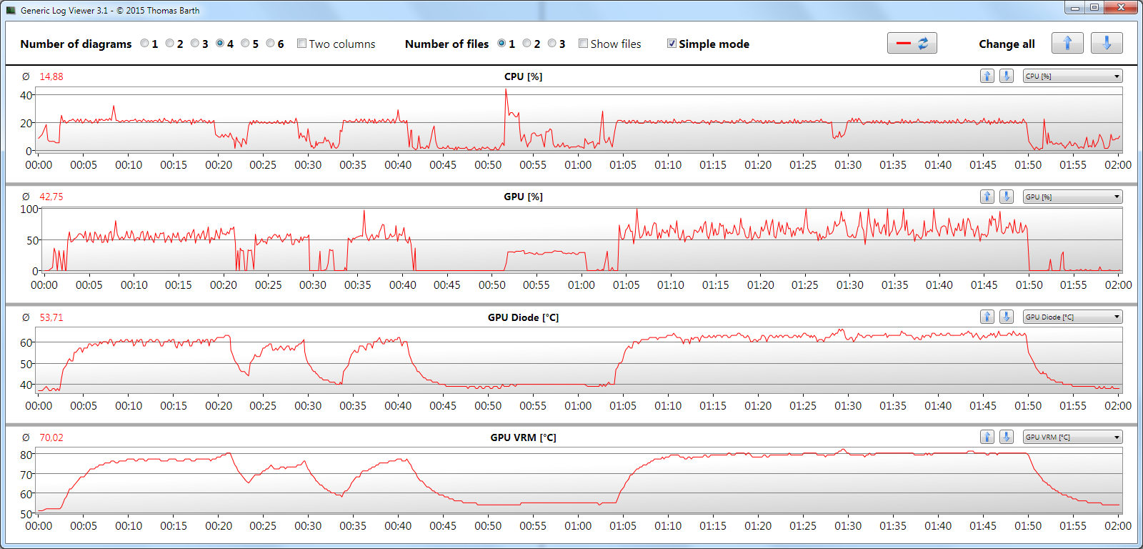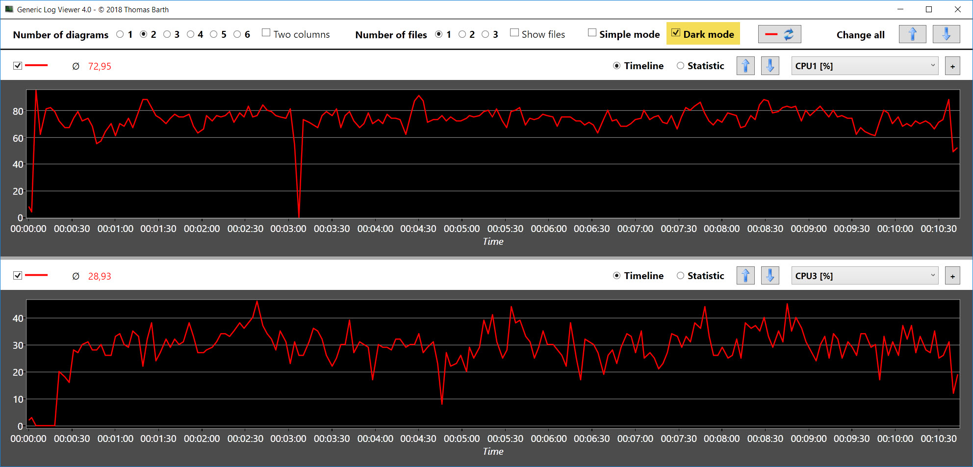 Allerdings finde ich, dass sich im "Simple"-Mode der benötigte Platz für die Dialogoptionen in Grenzen hält. Was aber gar nicht geht, ist die "zweizeilig beschriftete X-Achse" (auch das nach jeder Zeit "Uhr" steht habe ich noch nie gesehen). Darauf habe ich aber keinen Einfluss, die "Schrittweite" bzw. die ganze Beschriftung der Achsen wird von der verwendeten Grafik-Library automatisch eingestellt.