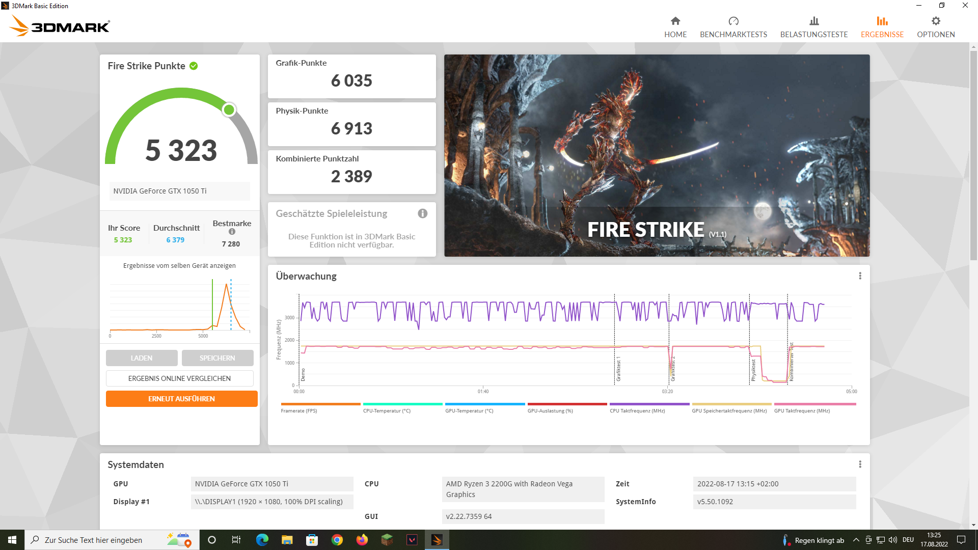Moin ich hab's gerade firestrike laufen lassen und kriege nur eine Gesamtpunktzahl von 5200 Punkten ist es normal? Weil der durchschnittlicher Score Kit der karte liegt bei 6000+ . Liegt das an meiner CPU? Und wieso erreicht Hardwaredealz mit seiner GTX 950 die schwächer ist als eine 1050 ti und seinen i5 4590 bessere Werte als ich? Ich verstehe es nicht
