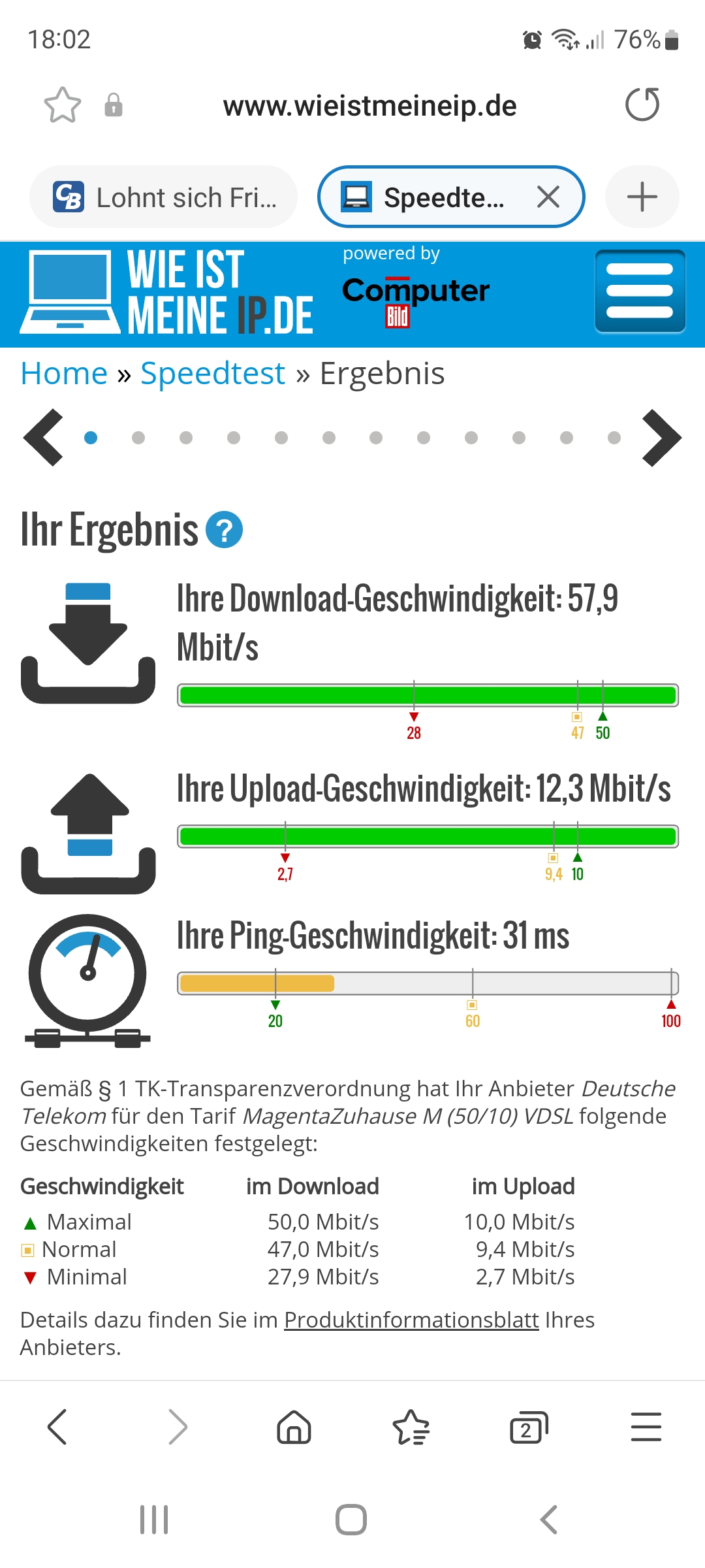Also, dann weißt du jetzt, dass - zumindest an der Stelle, wo du den Ookla Speedtest gemacht hast - via WLAN zwar die volle Internetgeschwindigkeit ankommt, die Latenzen unter Last aber zum Teil schon deutlich höher sind als via Kabel. Und wenn mehrere Geräte parallel auf das WLAN zugreifen, verschärft das die Situation natürlich zusätzlich.