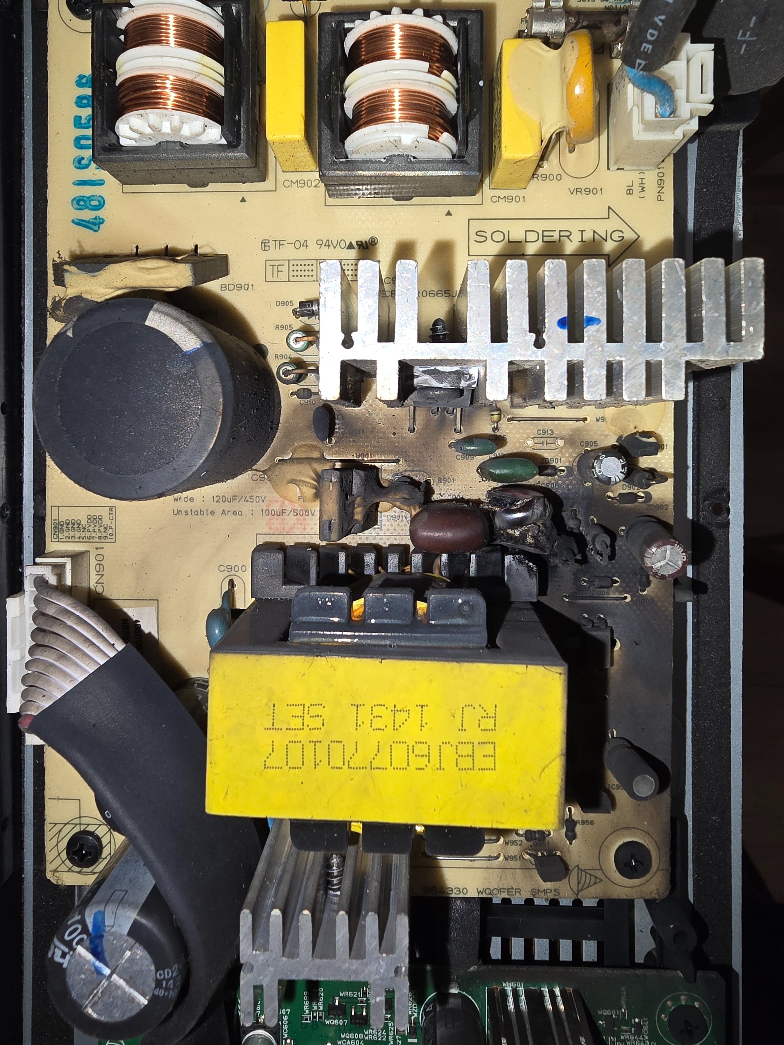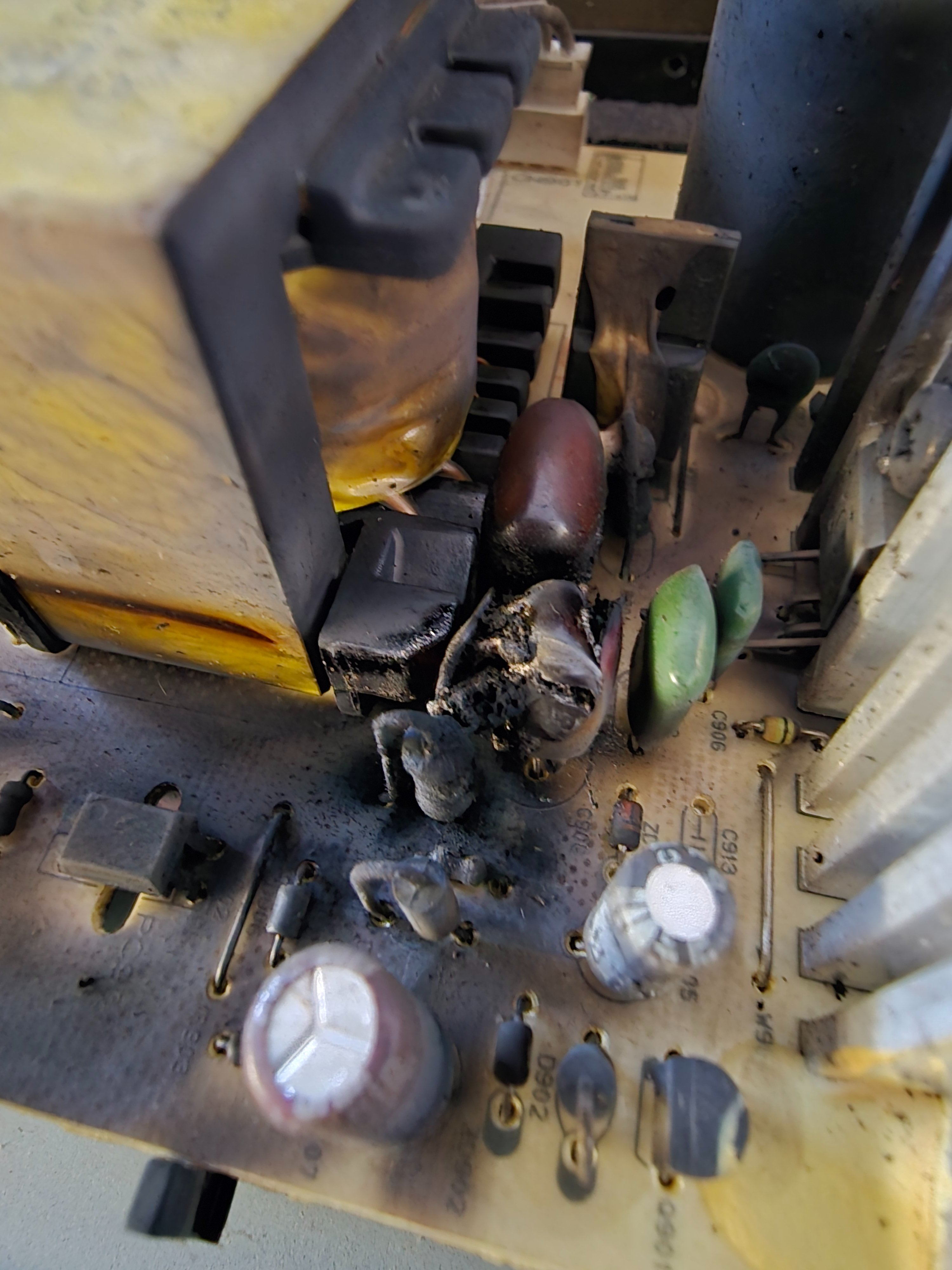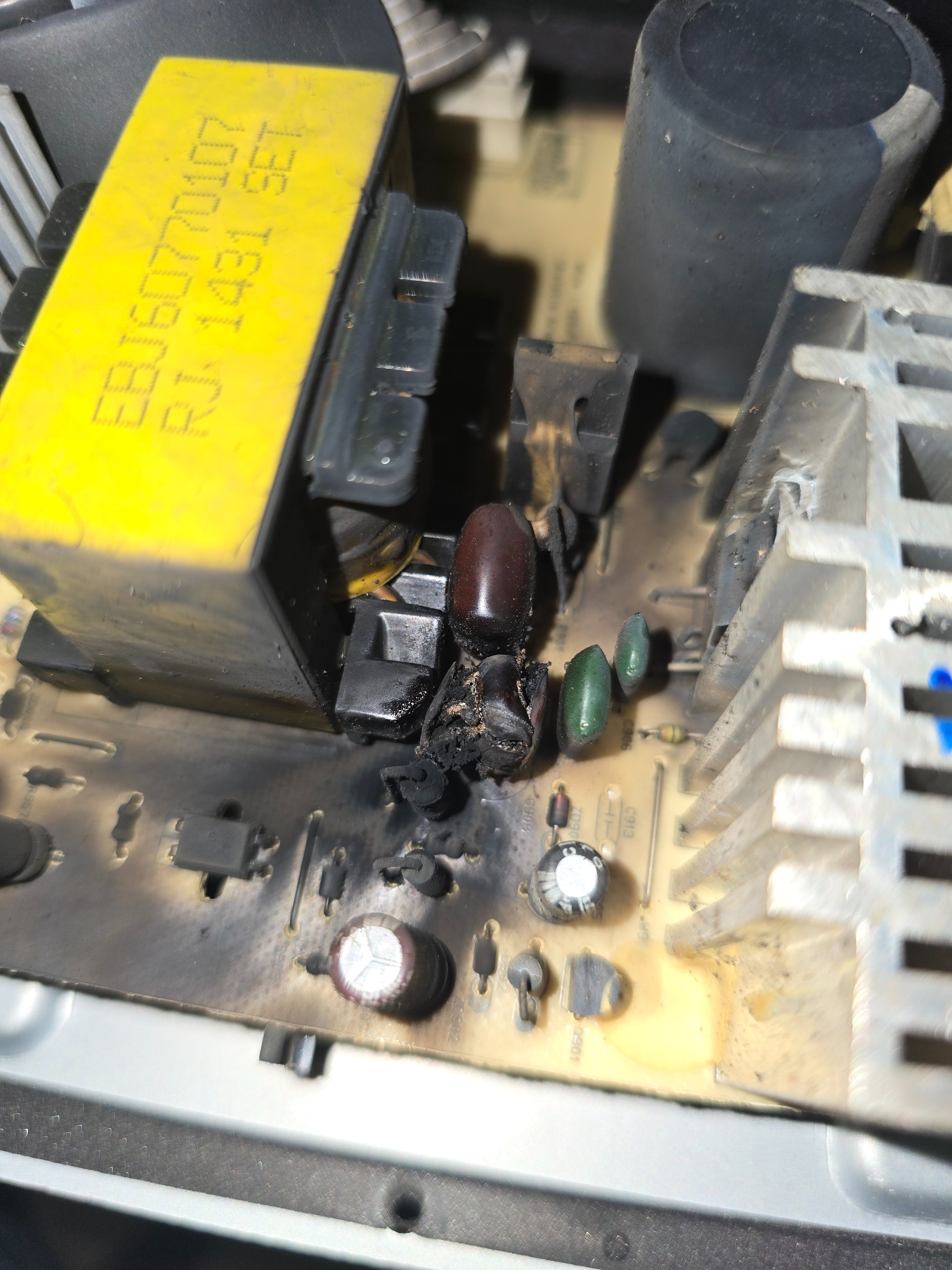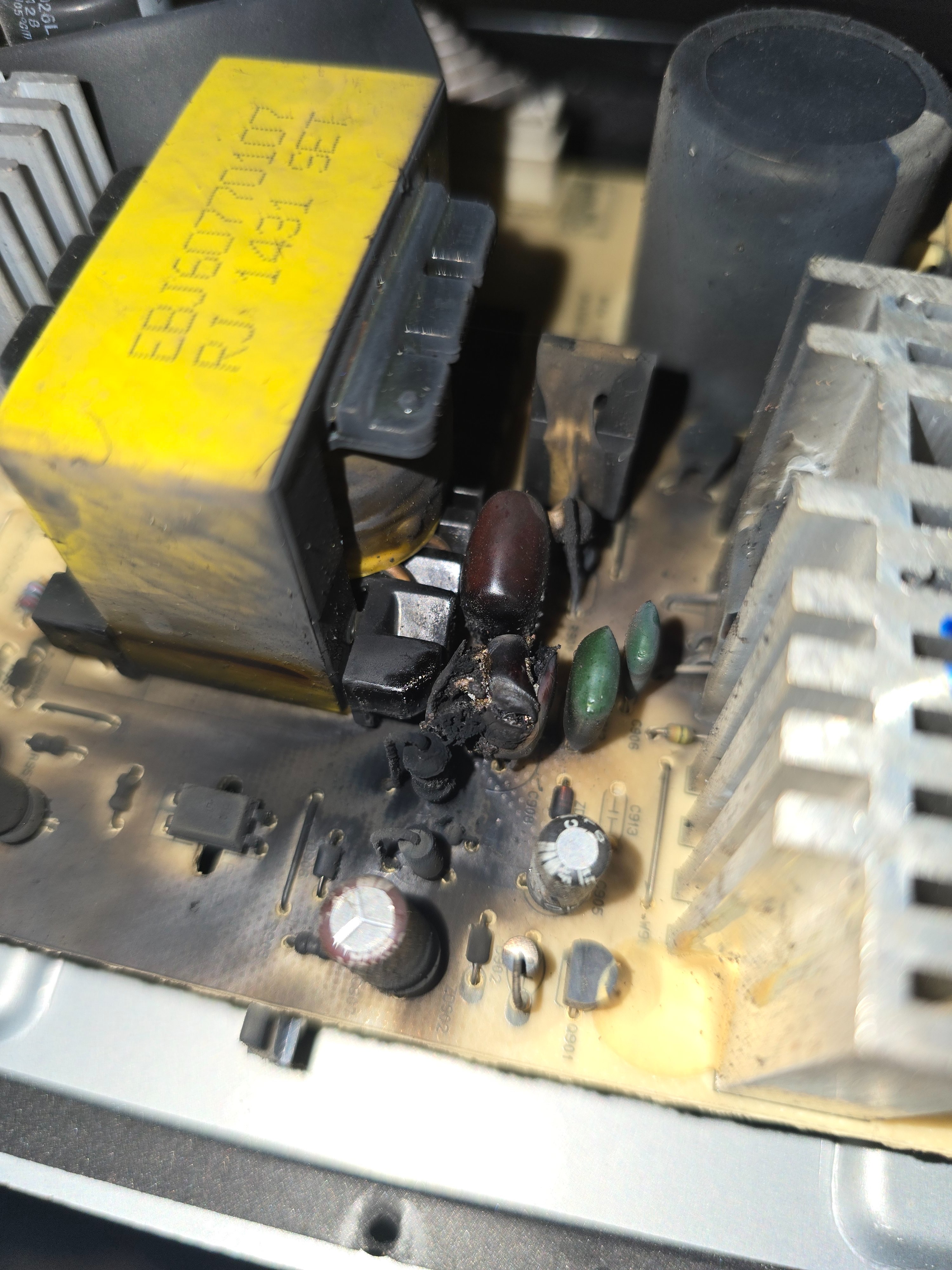 Scheint ein Kondensator (rot) geplatzt zu sein. Die kleine Glassicherung ist auch durch.