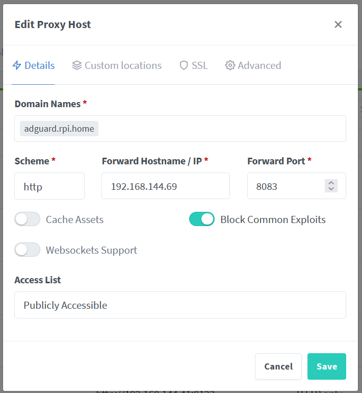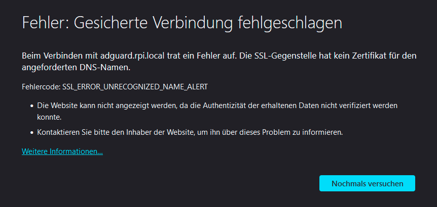 1. Auf dem Raspberry Pi läuft aktuell nur Adguard. Ich möchte aber in Zukunft hier noch weitere Container laufen lassen u.a. eine Nextcloud Instanz. Das Problem ist wenn ich z.B. adguard.rpi.local im Browser aufrufe, dann bekomme ich folgende Meldung