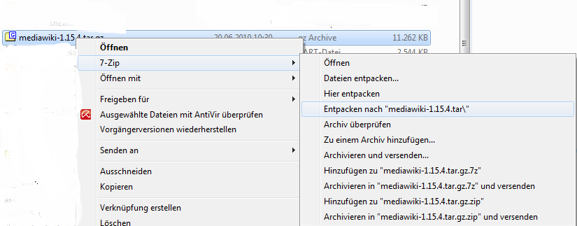 Die MediaWiki-Datei ist zweifach komprimiert. Entpacke sie entsprechend dem Bild. Danach findest du einen mediawiki-1.15.4.tar-Ordner. In diesem liegt die Datei mediawiki-1.15.4.tar, welche du erneut entpackst. Den entpackten mediawiki-1.15.4-Ordner öffnest du und du findest erneut einen mediawiki-1.15.4-Ordner.