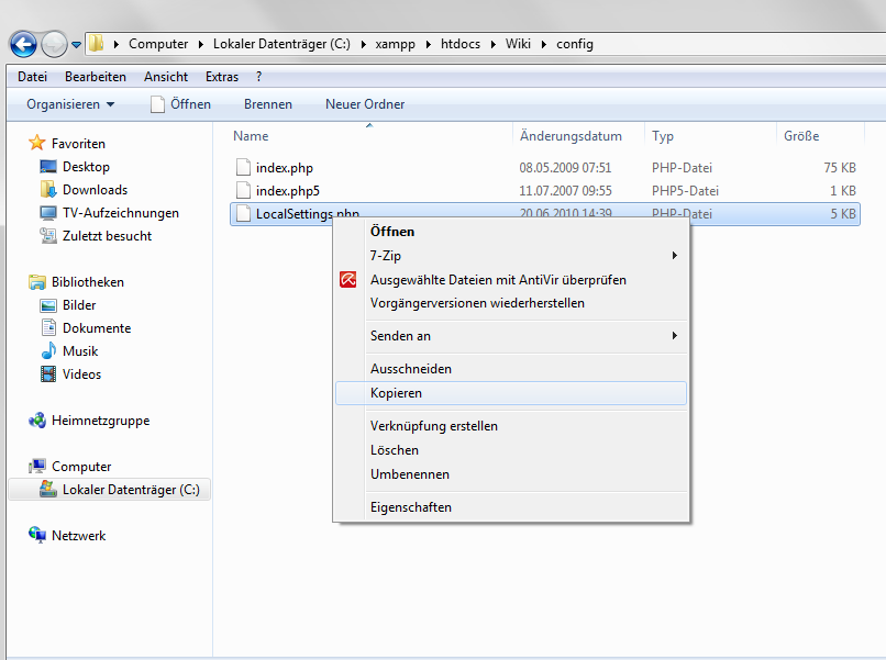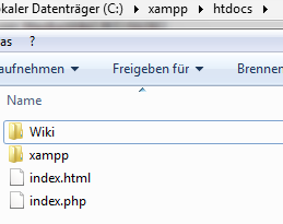Danach öffnest du den htdocs-Ordner erneut, öffnest dort den Wiki-Ordner und dort wiederum den config-Ordner und kopierst LocalSettings.php. (Pfad: C:\xampp\htdocs\Wiki\config)