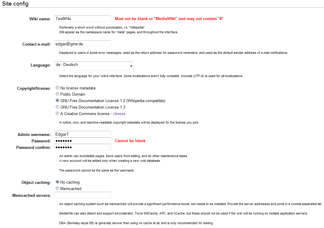 Nun gibst du den Namen deines Wikis ein, gibst deine E-Mail-Adresse an, stellst die Sprache auf Deutsch um, wählst dir eine Lizenzart aus und legst schließlich den Adminnamen und -passwort für das Wiki fest.