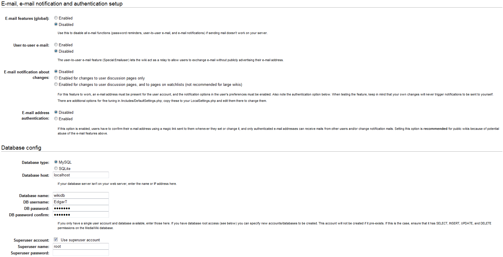 Die E-Mail-Dienste kannst du alle deaktivieren, da es sich um ein lokales Wiki handelt. Gib einen DB username an und lege ein Passwort fest. Setze ein Häkchen bei Use superuser account, gib bei Superuser name root ein und lass das Passwortfeld frei.