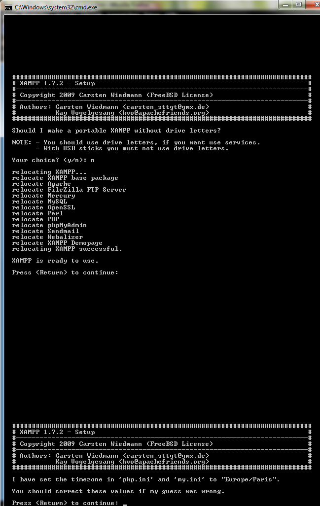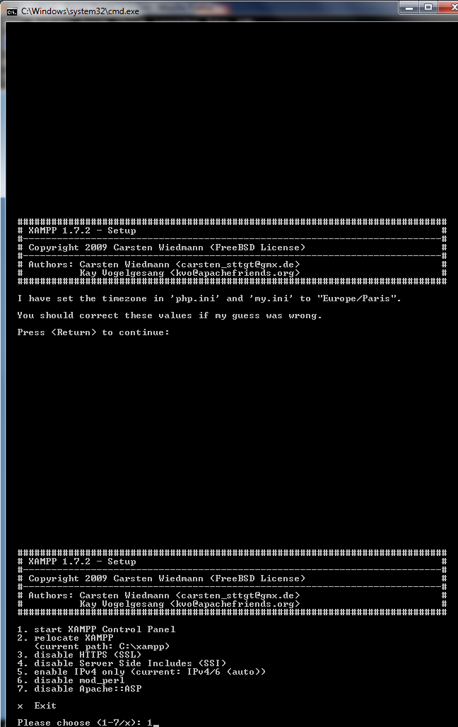 Das Kommandofenster wird gleich geschlossen. Drücke einfach 1 und bestätige mit Enter, um XAMPP zu starten. Es öffnet sich ein neues Fenster und du kannst das Kommandofenster schließen.