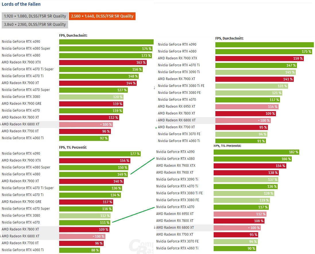Hingegen der Abstand zur RTX 4070 zur RTX 4070 Super im einstelligen Bereich bleibt und bei steigender Auflösung sogar weniger wird.