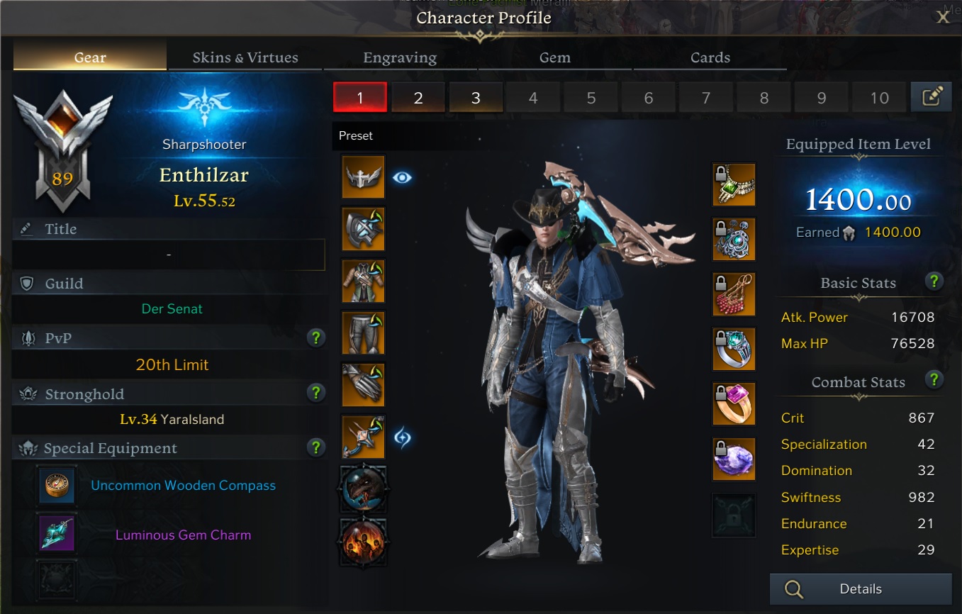 Auf Asta hat meine Frau vor ein paar Tagen ein Spieler angezeigt mit 1495, nur 10er Juwelen, dem Legendary Charm fĂŒr Inselmarken, lila fĂŒr Crafting und Insel LvL 57. Manche Leute sind einfach absurd in ihrer Zeit und ihrem Geldausgabe Verhalten