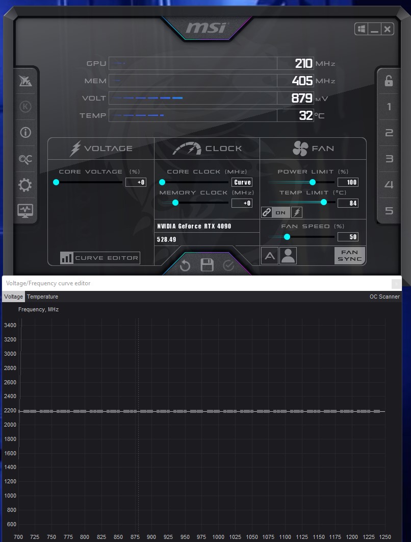 Ich habe per Afterburner die Kurve schräg aufgezogen, also einen Punkt rechts fixiert und so lange hochgezogen, dass bei 0.95V etwa +200MHz angestanden sind und darüber hinaus alles glatt gebügelt.