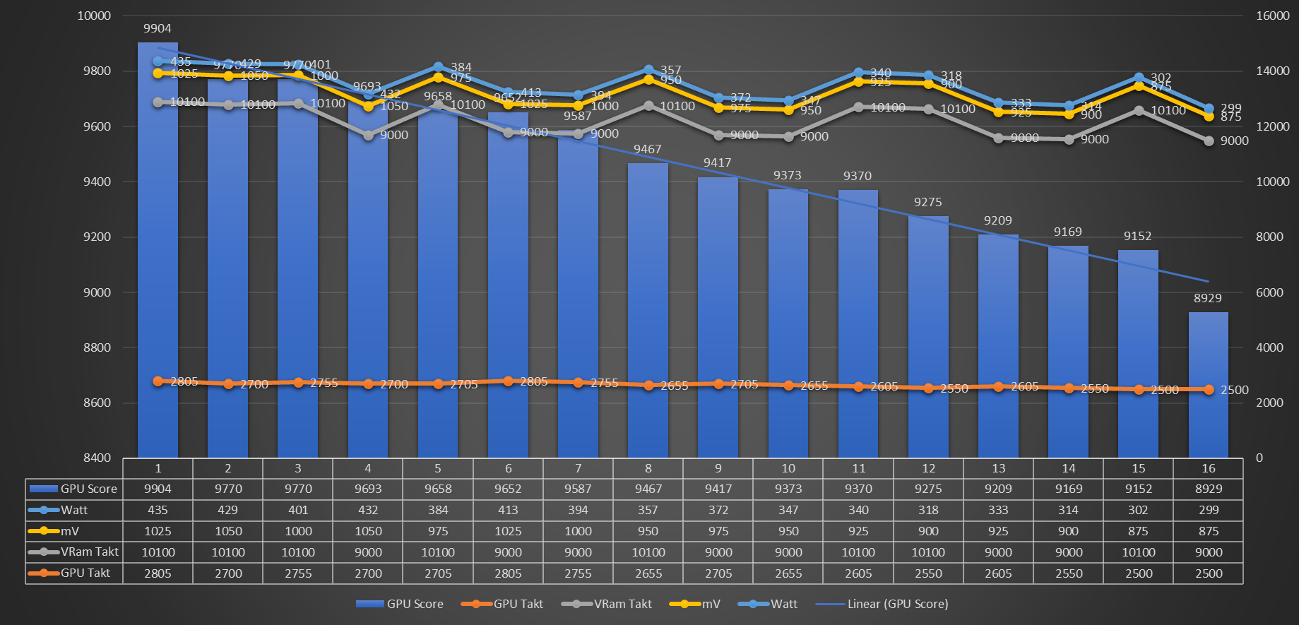 Tabelle GPU Score / GPU & VRam Takt / mV / Watt