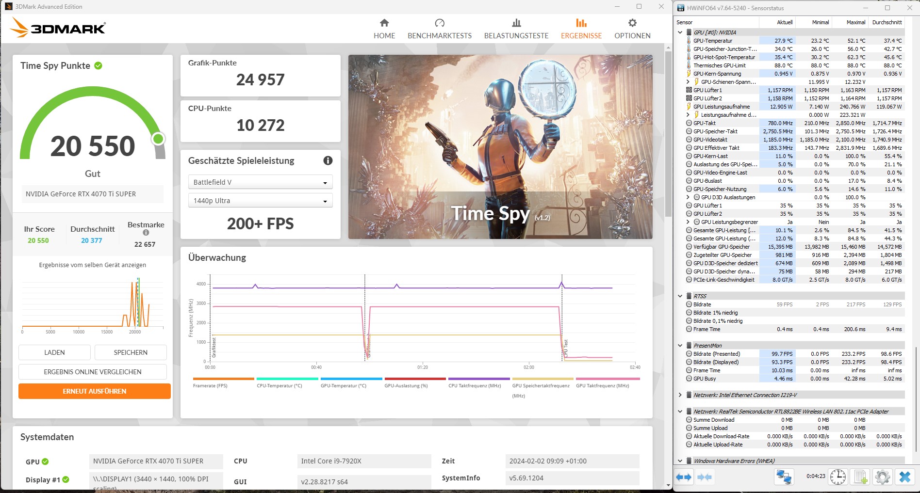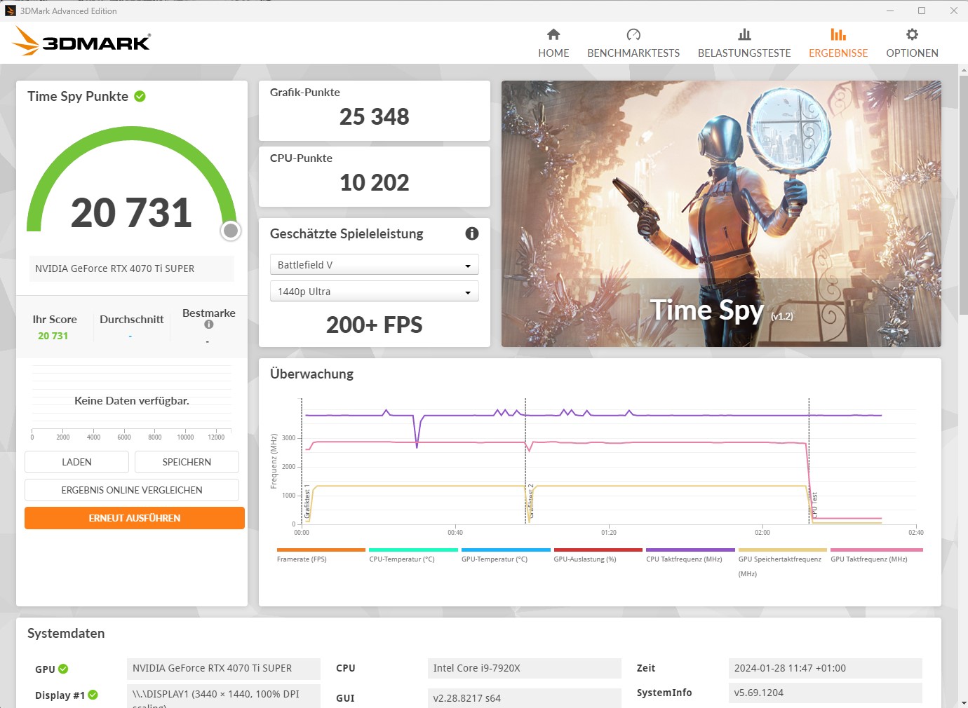 Das sieht jetzt m.E. eigentlich gut aus wenn du den Graphics Score betrachtest worauf die Diskussionen sich hier und die Vergleichswerte im Netz beziehen. Da hast du jetzt 24246 Punkte. Das könnte Messtoleranz sein (vielleicht schon zu warm die Karte während des Bench, Hintergrunddienste in Windows etc.), die Karte selbst vielleicht etwas langsamer ist oder wie du sagst, dass Windows einen weg hat.