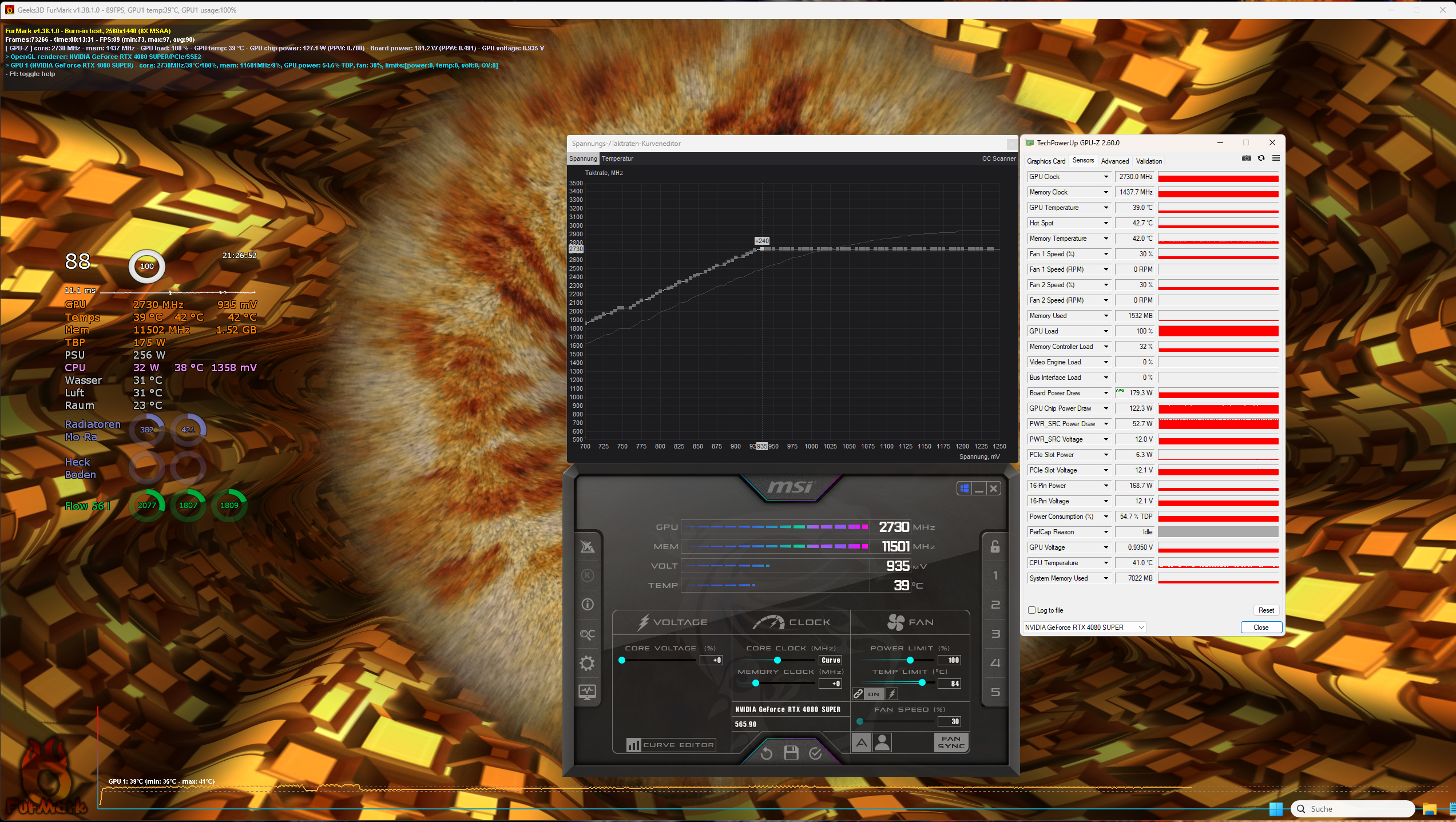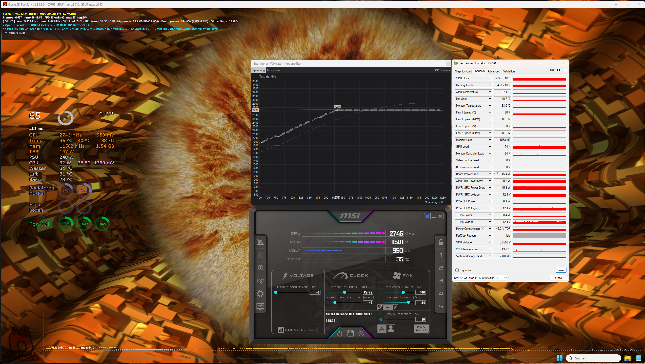 So ich hab mal getestet um zu sehen was die 4080 vs 4080S im Verbrauch macht. Gleiche FurMark Einstellungen denke ich.Shir Khan schrieb:Gern, aber lass uns das andersherum machen: Zeig, was du sehen willst und ich stelle es dann nach. Meine Karte sollte aufgrund guter Kühlung eine recht große Taktbandbreite abbilden können.