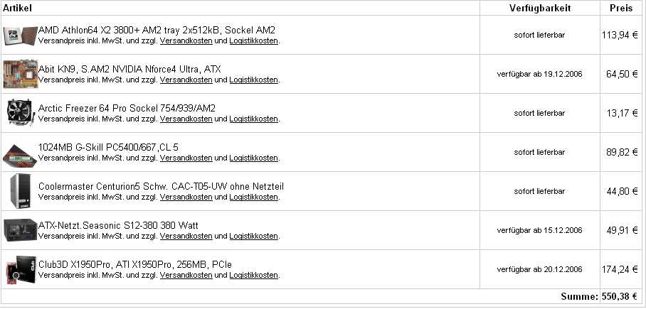 Wie man schon sieht unterscheiden die beiden Systeme nur im Prozessor und Board. Beim Intel-System stehe ich momentan bei 599 Euro und beim AMD-System bei 592 Euro. Hinzu kommen dann noch ein paar Kleinteile und der Versand. Ich hoffe, guter Rat ist nicht allzu teuer und ihr seid es noch nicht leid, zu NOCH einem System NOCH eine Meinung zu posten. Jedenfalls ist jede Meinung oder Kritik herzlich willkommen.