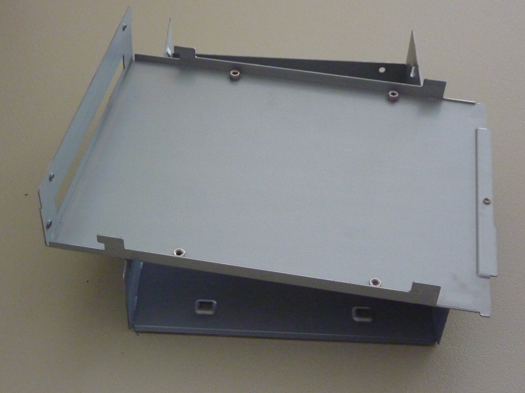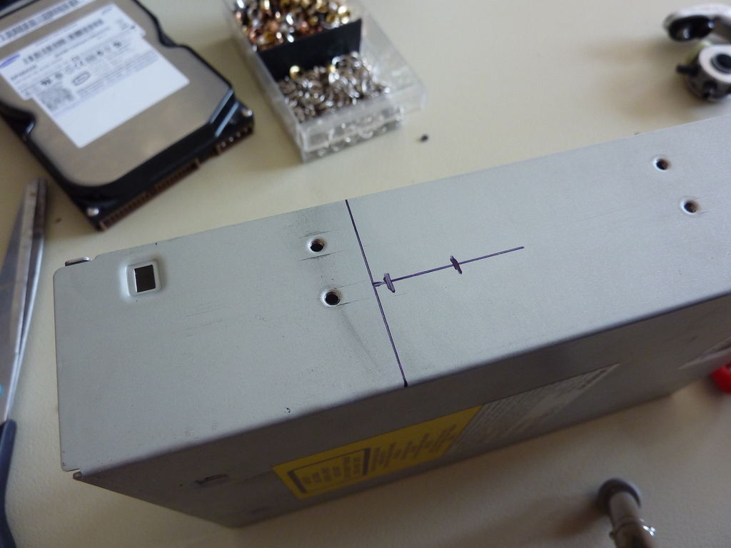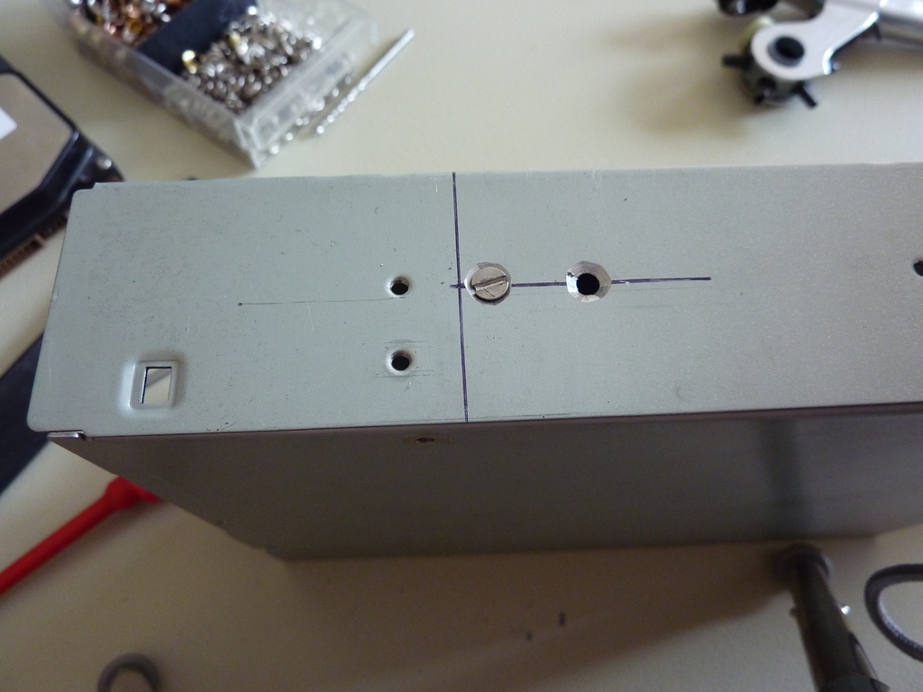 ) bohren. Da ich keinen Senkbohrer hatte, habe ich die Bohrlöcher einfach mit einem 12er Bohrer angesenkt. Man sollte darauf achten, dass die Schrauben wirklich bündig (bzw. tiefer) als die Oberfläche sind, sonst bekommt man das Laufwerk nachher nimmer in die 5½"-Schächte. Auch das Entgraten sollte man nicht vergessen