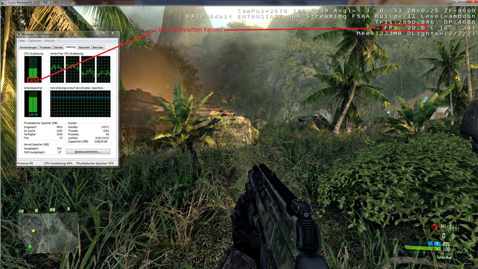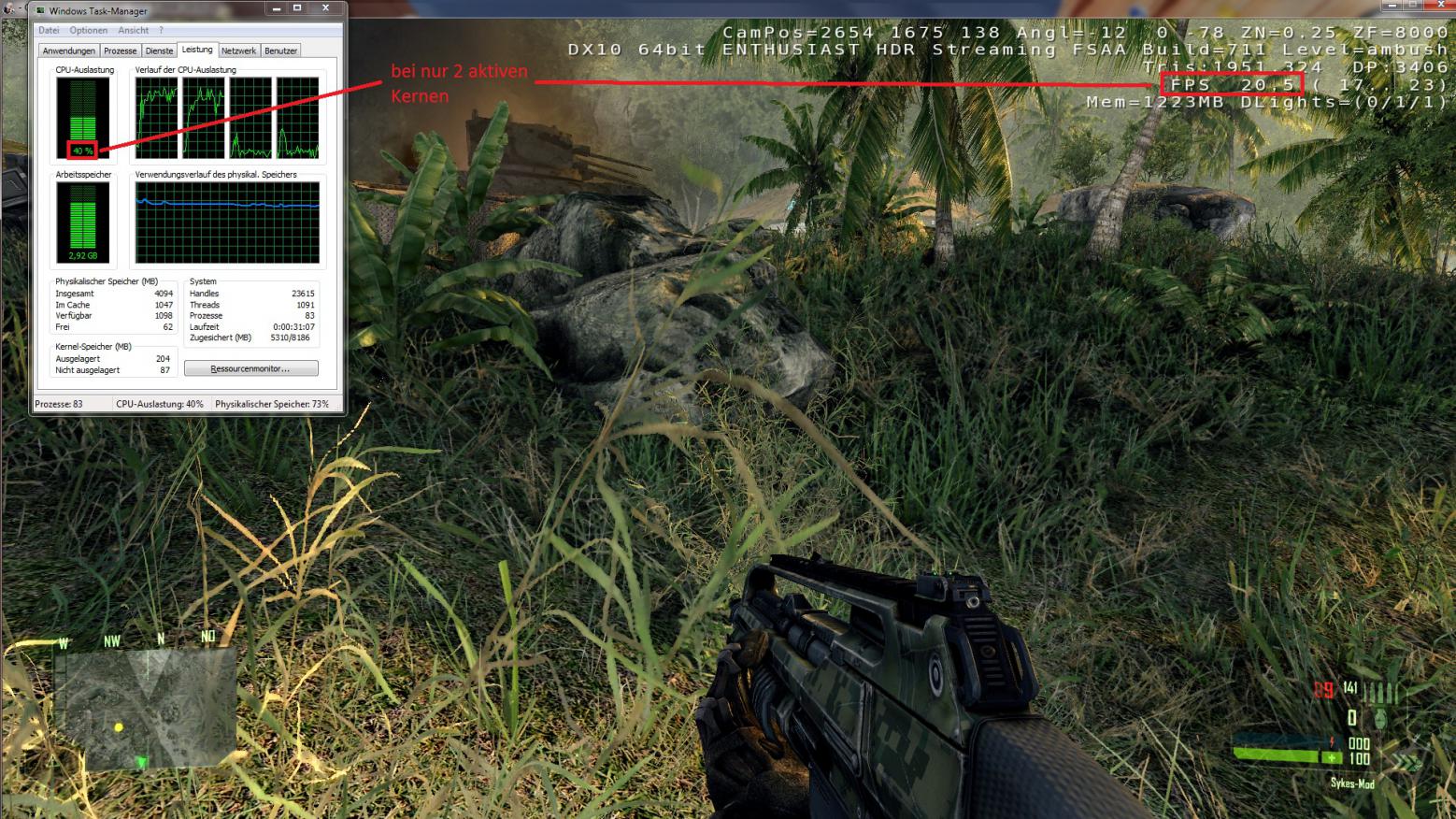 Nun ist die Frage ob da etwas mit der Grafikkarte nicht stimmt oder ob ein anderes Element in meinem PC einfach nur extrem ausbremst. Für mich sieht es so aus als würde die Grafikkarte ausgebremst da sich an den FPS nichts tut obwohl man AA von 0x auf 16x stellt, die Frage ist nur von was. Die 4 Prozessorkerne geigen die gesamte Zeit auf ca. 50% Auslastung rum. Was sagt ihr dazu? Vielen Dank schonmal im Vorraus!