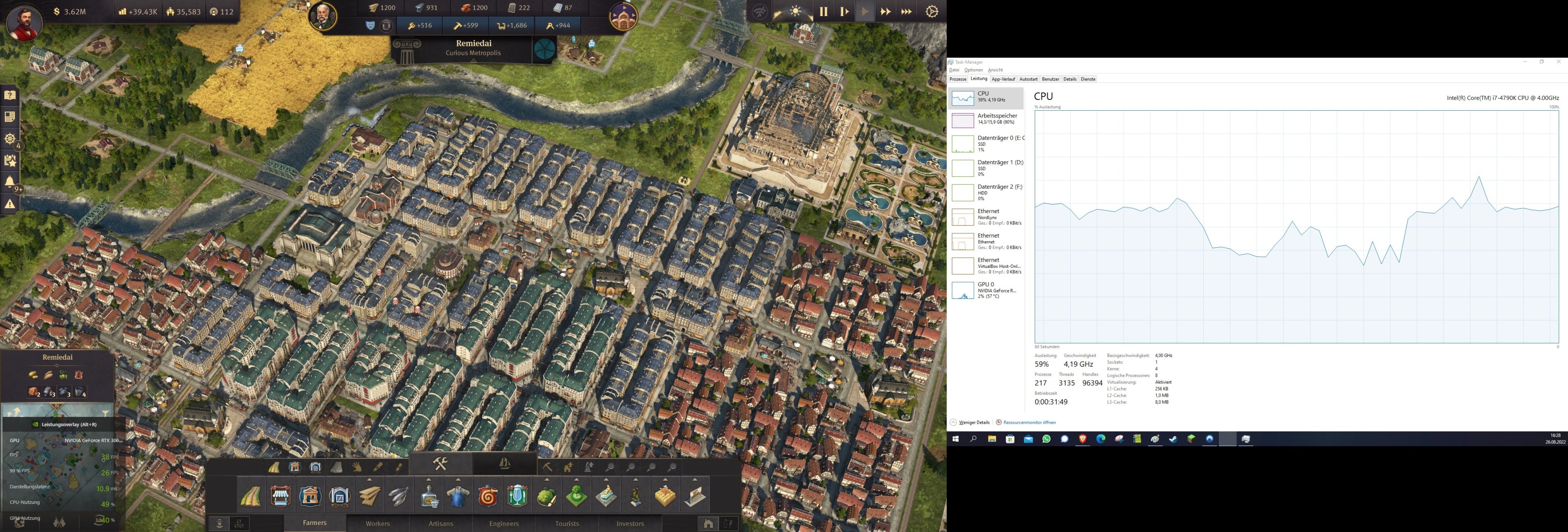Im Screenshot: Anno 1800 ingame Screenshot mit FPS links unten + Taskmanager im Leistungstab, aus welchem eine CPU Auslastung von 60% und eine RAM Auslastung von 90% hervorgeht.