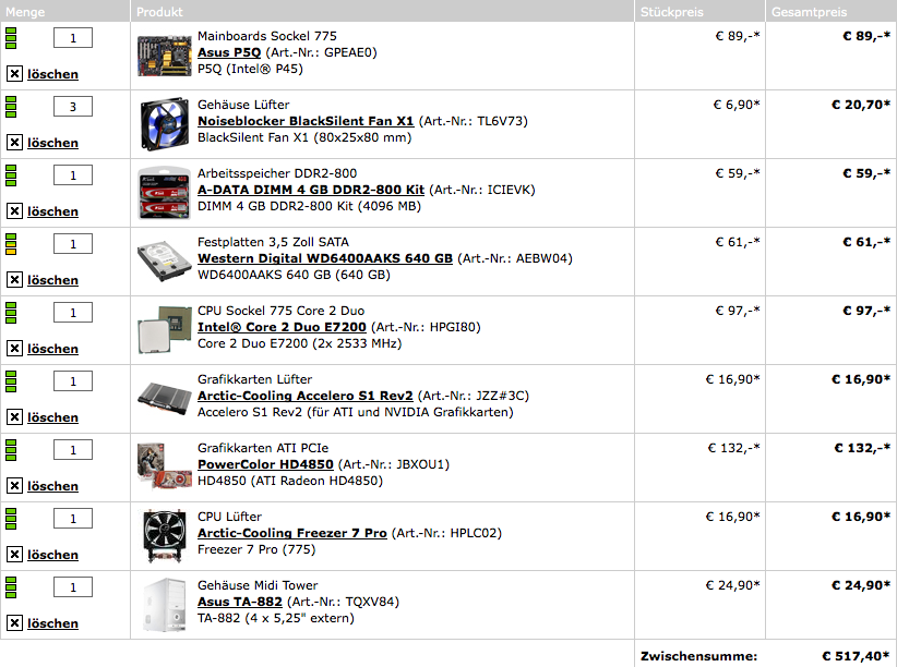 Im nächsten Thread werd ich dann die Komponenten; CPU + Lüfter, Mainborad, Gehäuse + Lüfter, Graka + Lüfter, Festplatten usw. hier rein posten welche ich mir da so vorstelle … geh mal jetzt auf sie Suche (sonst wird mir auch die Einleitung zu lang)