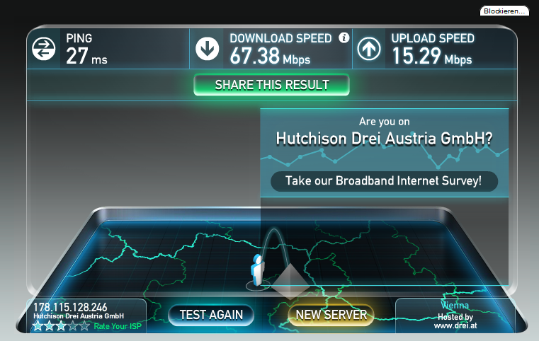 @LukS: Bist du dir sicher dass du die 70 Mbit wirklich bekommst und nicht nur im speedtest auf dem drei.at Server? Da sind nämlich die Drosselungen nicht aktiv. Speedtest zeigt dir in diesem Fall also die Bandbreite an die maximal möglich ist. Aber kann natürlich auch anders sein, kommt bei 3 oft genug vor dass die Drosselung warum auch immer nicht aktiv ist.