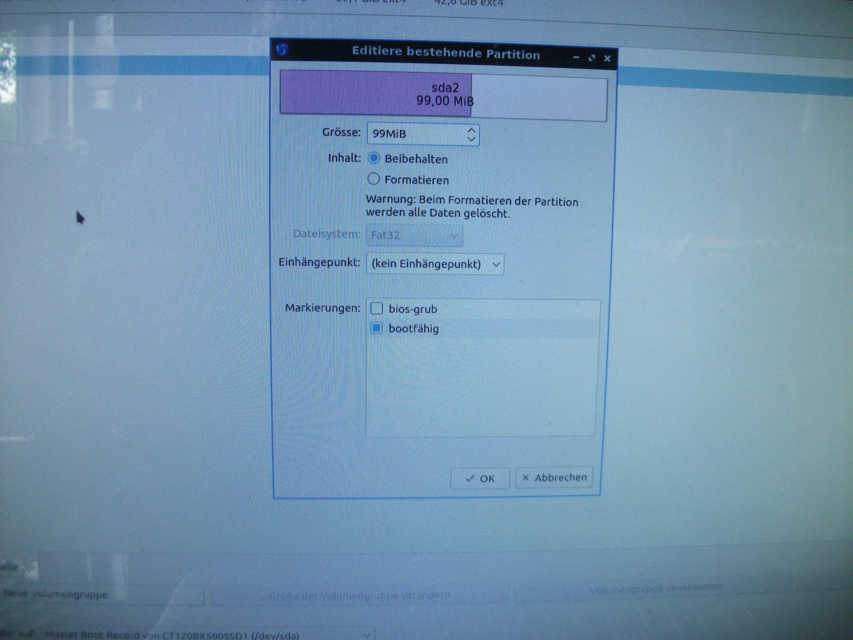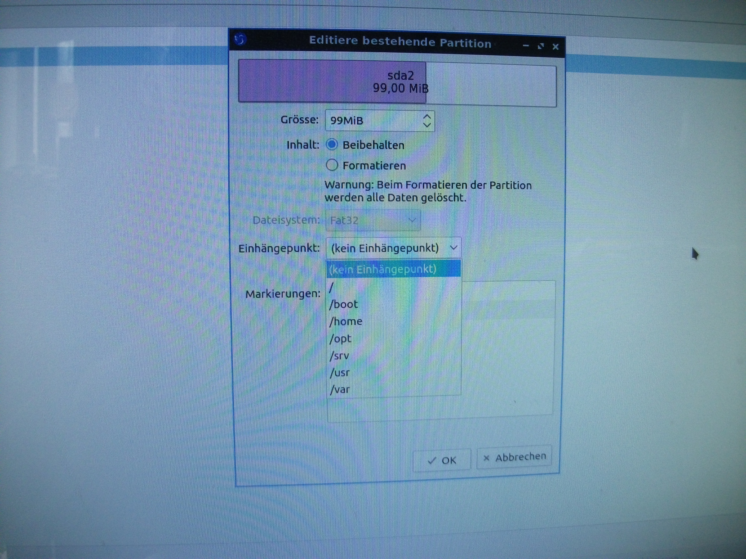 Wie? Find keine Möflichkeit dazu.Garmor schrieb:Du musst jetzt noch sda2 als/boot/efieinbinden. Nicht formatieren.