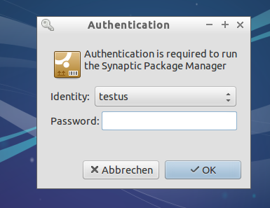 Wenn ich mich mit diesem Benutzer anmelde und dann Synaptic starte bekomme ich die Abfrage nach einem Nutzer mit Adminrechten: