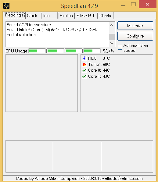 Das Programm Speedfan sagt auch dass die HDD immer bei 31C° liegt und (ich nehme mal einfach an die Plextor) bei 50-61°C. Dann ist hinter den 50°C auch noch ein Feuerymbol was wohl dem laien signaisieren soll: Gefahr schlecht!