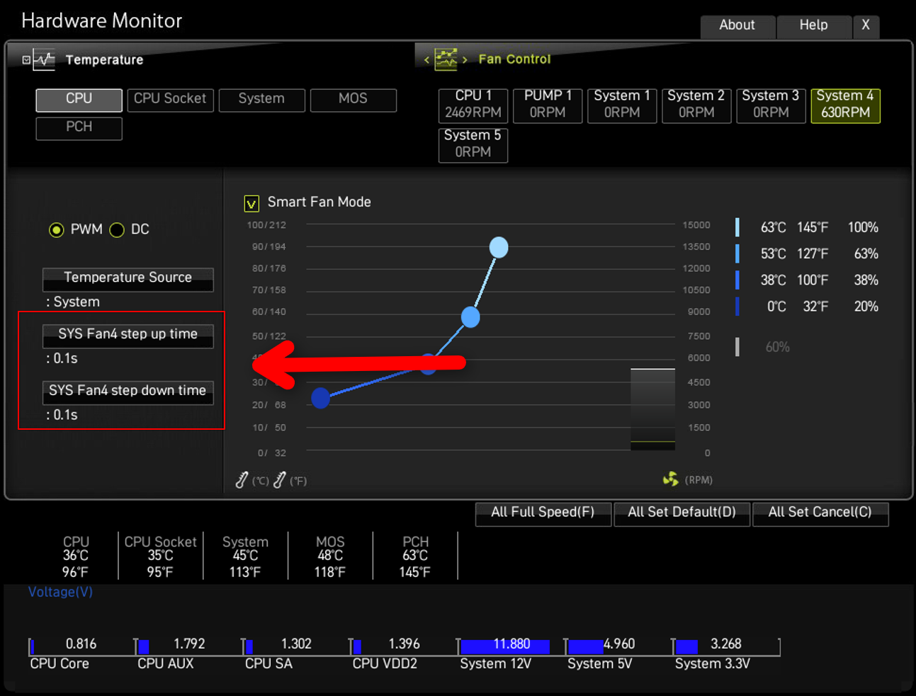 Entweder hast du die Möglichkeit, mit der Lüfterkurve eine Verzögerung mit einzustellen, damit nicht gleich mit jedem Temperaturunterschied die Lüfter hochdrehen oder du setzt die Kurve nach meiner nachfolgenden Skizze ein.