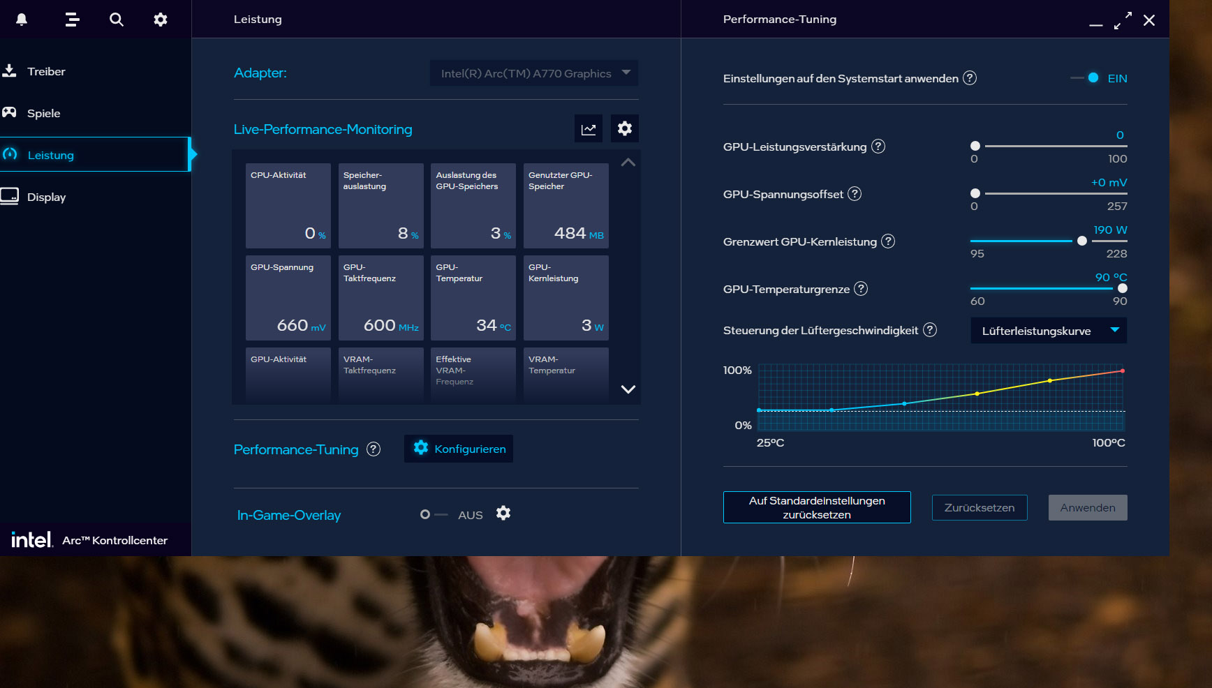 Im Automatik-Modus wechselt der Lüfter immer zwischen 0 und 30%. Bei definierter Lüfterkurve wechselt der Lüfter ebenfalls laufend die Drehzahl, allerdings nicht ganz so extrem wie im Automatik-Modus. Im komplett manuellen Modus, also einer fest eingestellten Drehzahl, gibt es ebenfalls Schwankungen. Mal von 0 bis zum eingestellten Wert, manchmal leicht um den eingestellten Wert herum.
