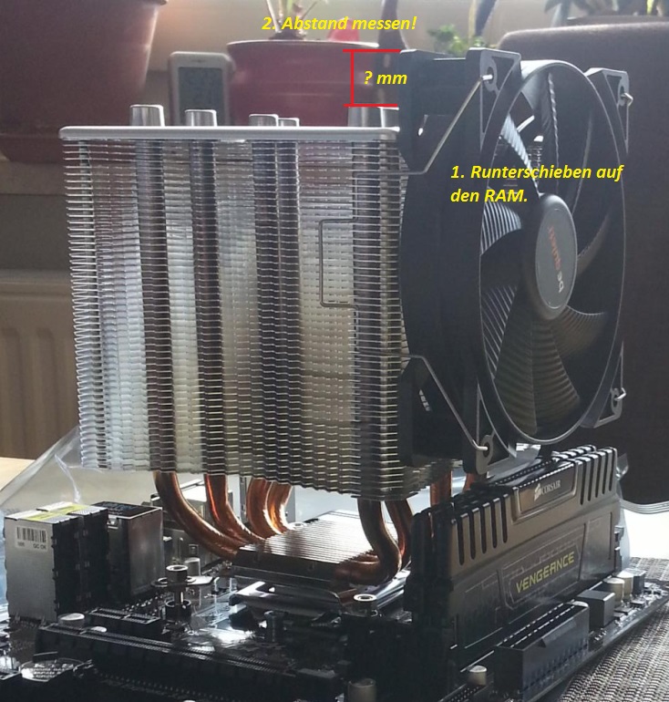 Ja ich weiß dass er den berühren darf, aber er ist ja noch befestigt, der rutscht ja noch ein bisschen runter, sodass er dann schätzungsweise knapp vor dem RAM sein sollte. Und ja es sind 2cm, hab nochmal nachgemessen.