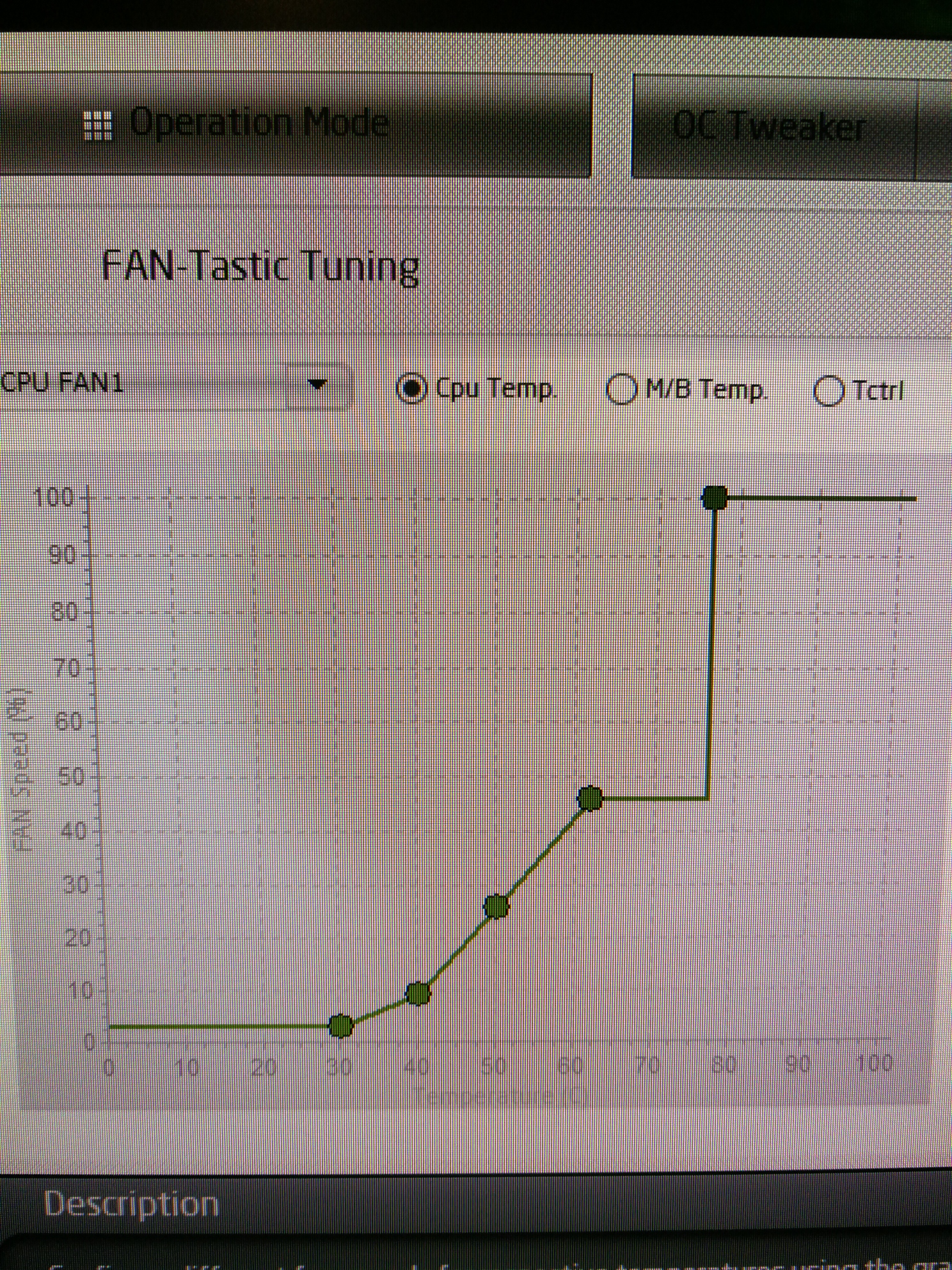 Allerdings gibt es bei AsRock auch die Option, das ganze manuell einzustellen. Dazu kann man 5 verschiedene Temperaturschwellen auswählen und die jeweilige Lüfterdrehzahl in %, also beispielsweise dass der Lüfter bei 30° CPU Temperatur mit 30% der maximalen RPM drehen soll.